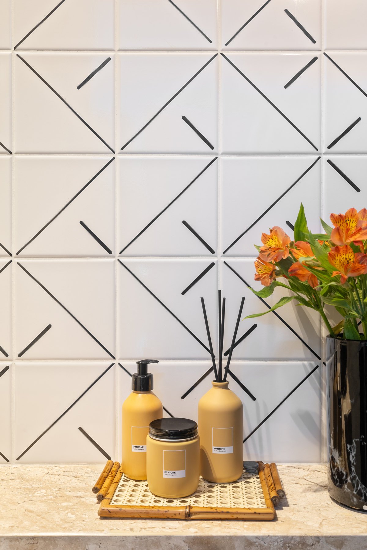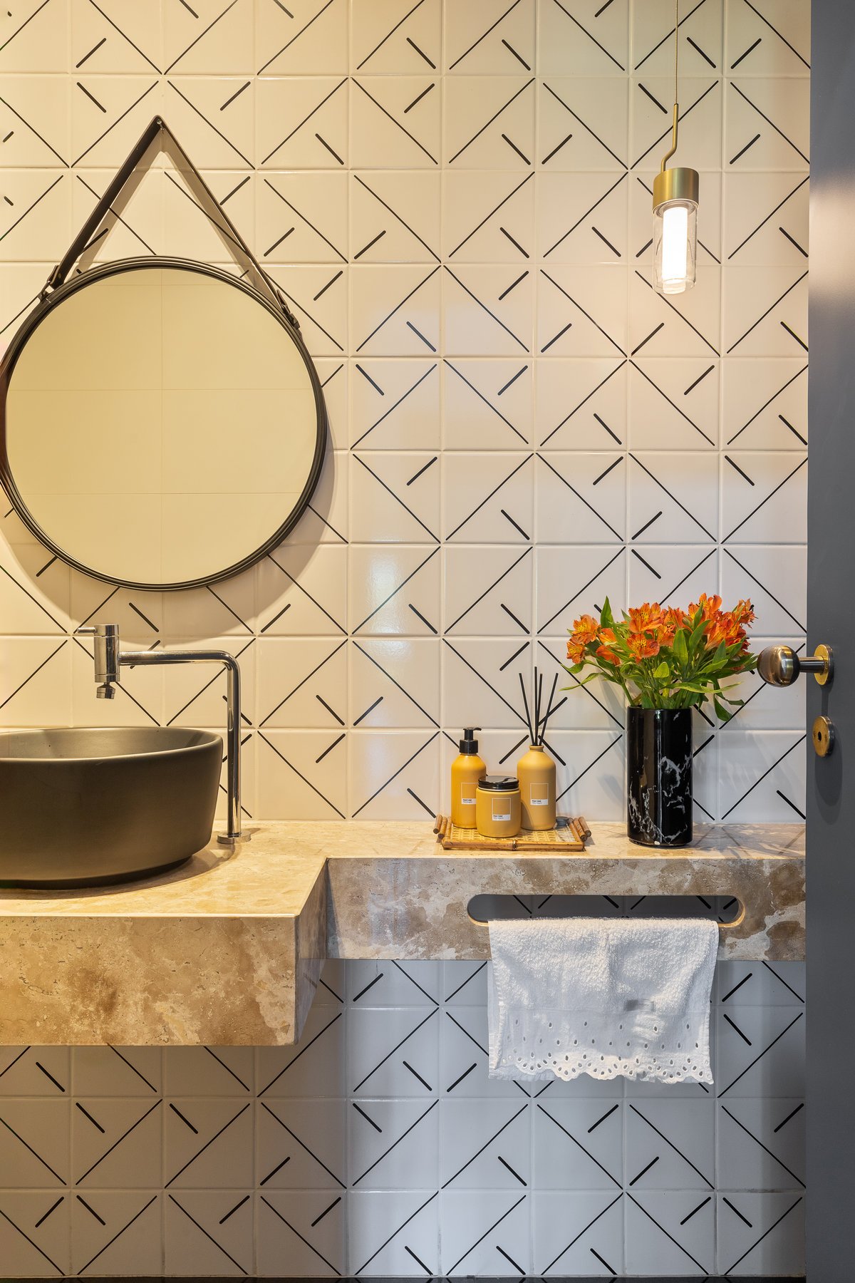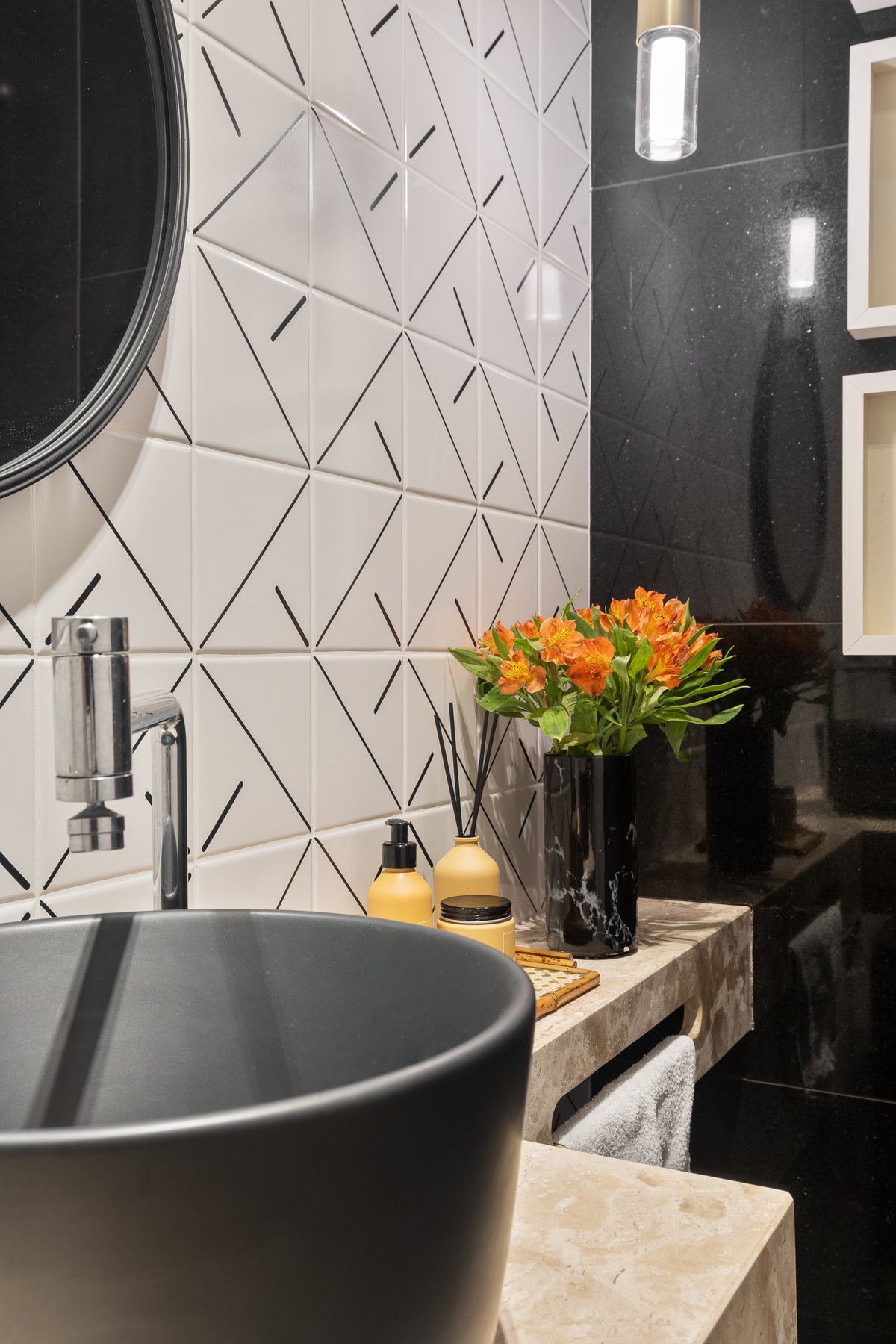 Pequeno em área, mas grande em estilo, o lavabo recebeu azulejos pretos exclusivos, com traços retos e elegantes. O resultado é um ambiente sofisticado, de personalidade marcante, que impressiona pela leveza e refinamento.