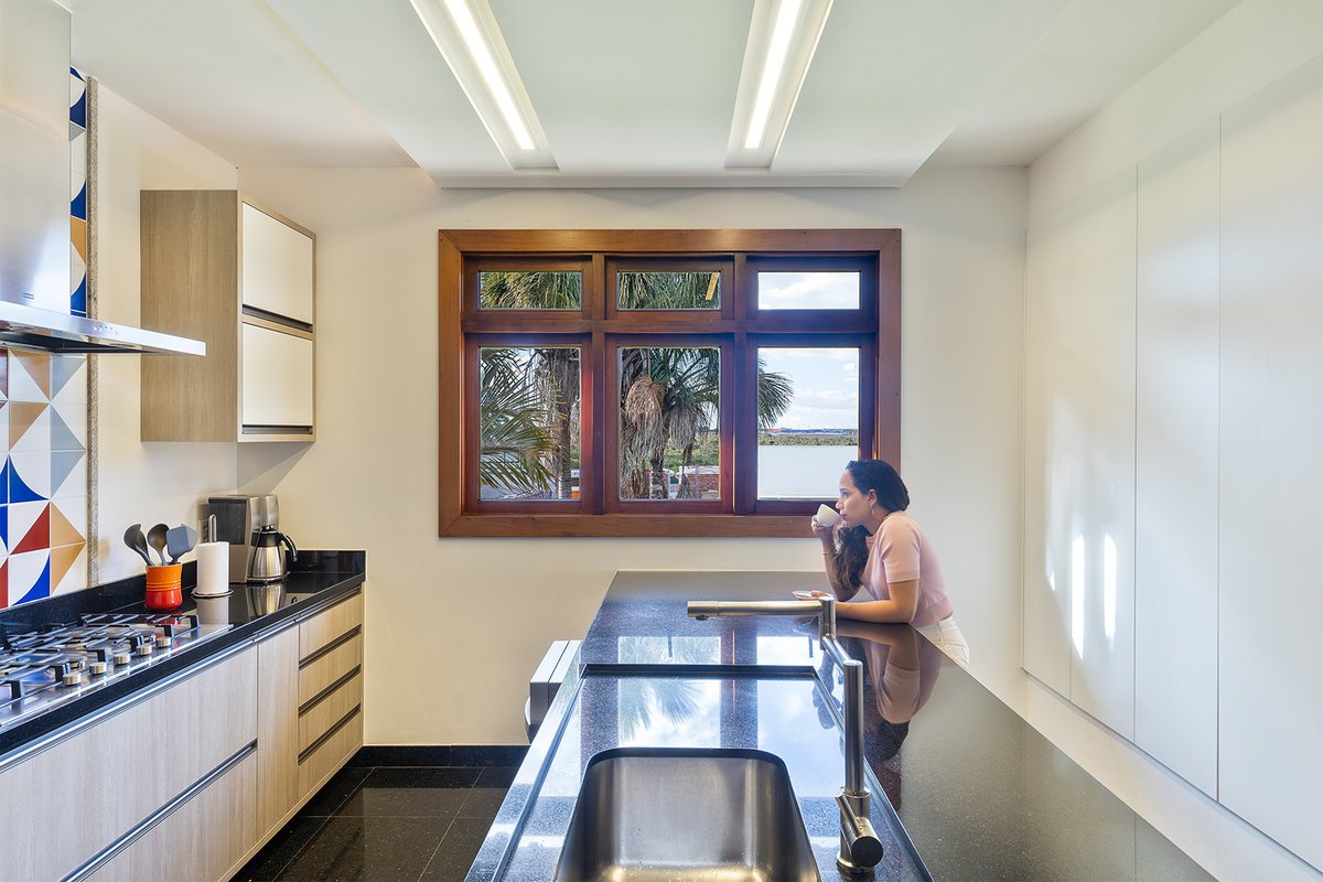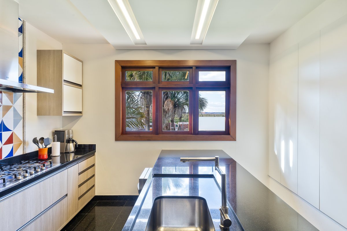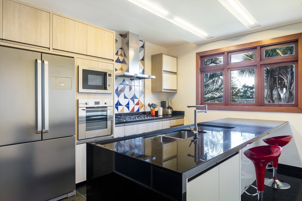A cozinha foi completamente repaginada para atender ao desejo do morador, apaixonado por cozinhar. O ambiente ganhou uma ilha central, permitindo tanto a preparação dos alimentos quanto a realização de refeições rápidas. De um lado, a área de cocção e lavagem; do outro, um espaço aconchegante para convívio.
