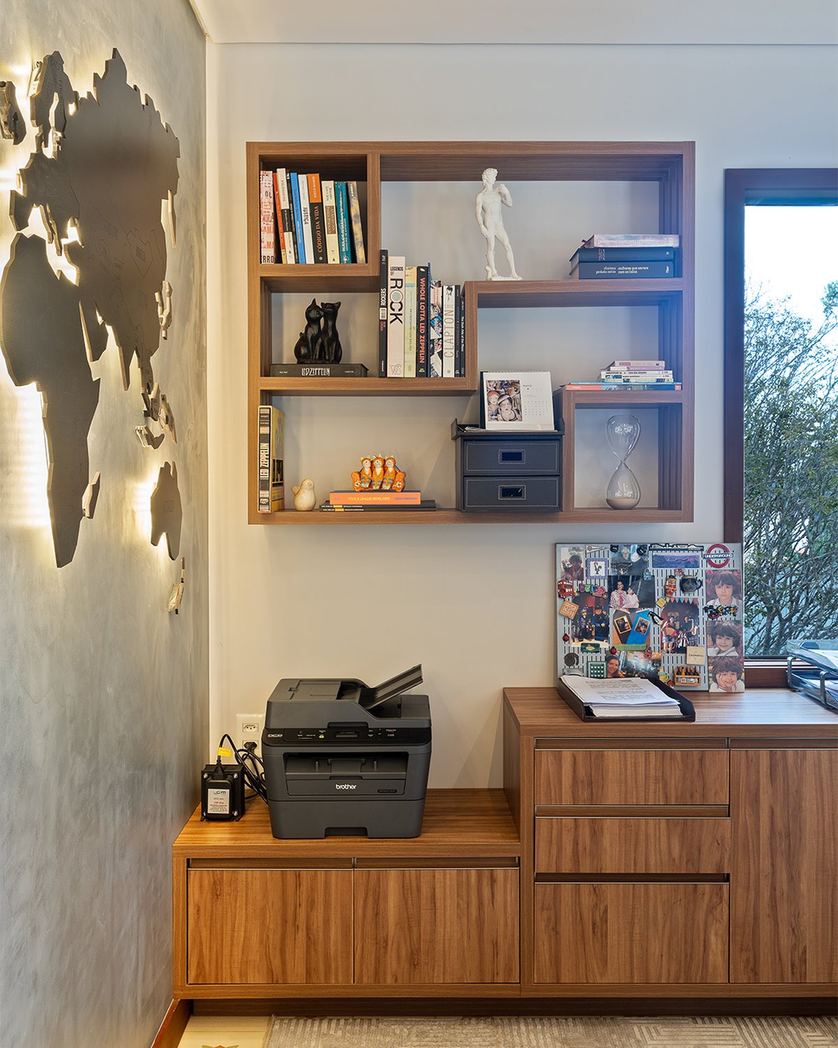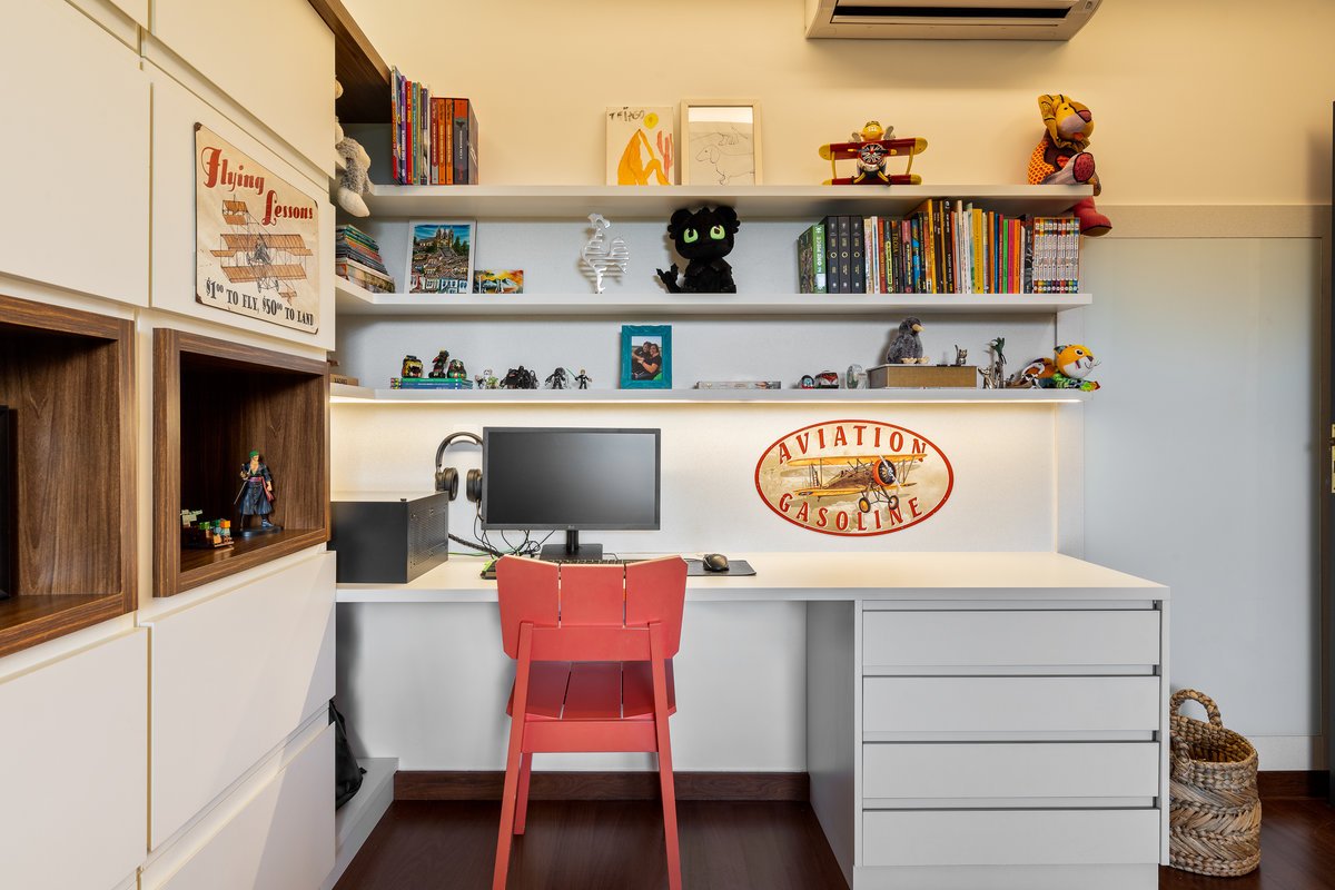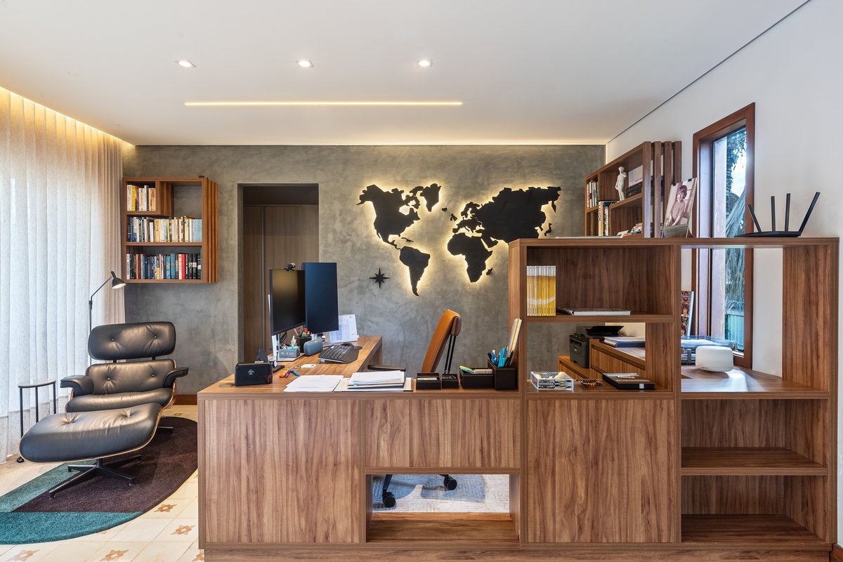A marcenaria planejada delimitou o espaço com elegância, enquanto o tapete adicionou aconchego e sofisticação. O grande destaque fica para a poltrona Charles Hermes com PUF, que, acompanhada de iluminação bem posicionada e livros cuidadosamente dispostos, trouxe personalidade e requinte ao ambiente. O resultado é um home office que alia beleza, funcionalidade e identidade.