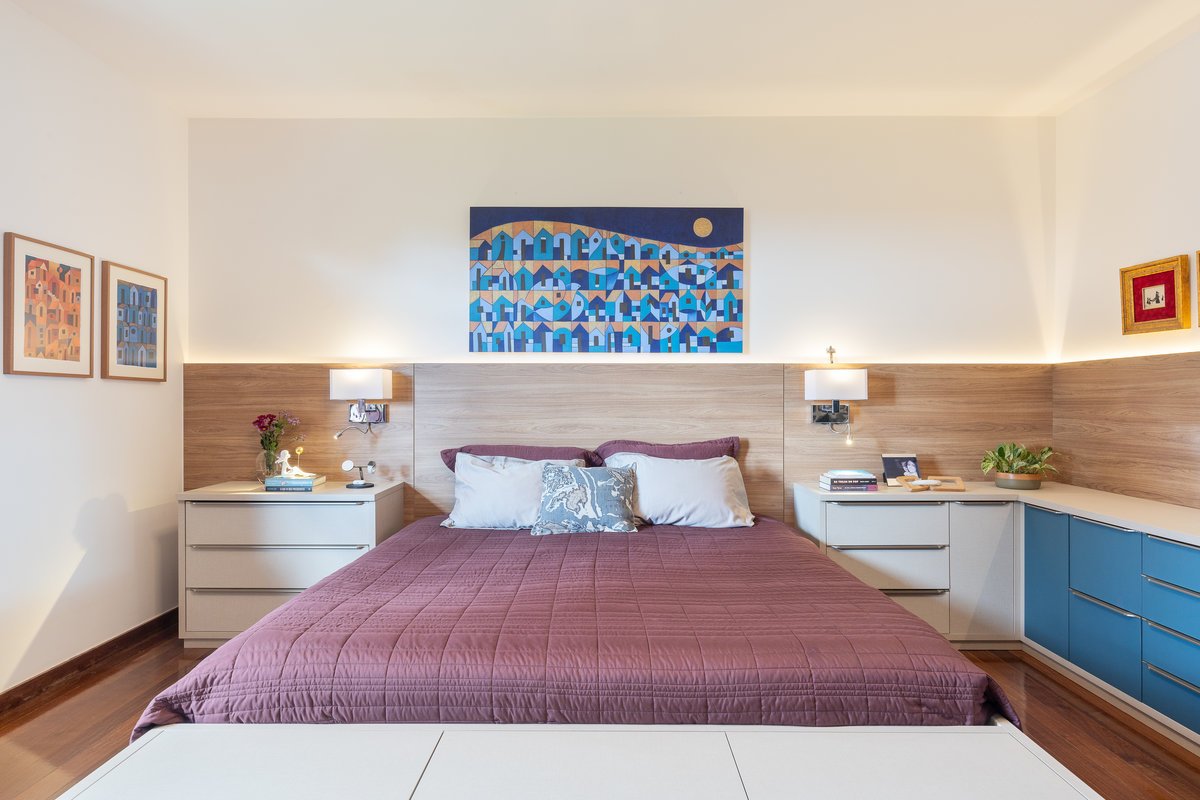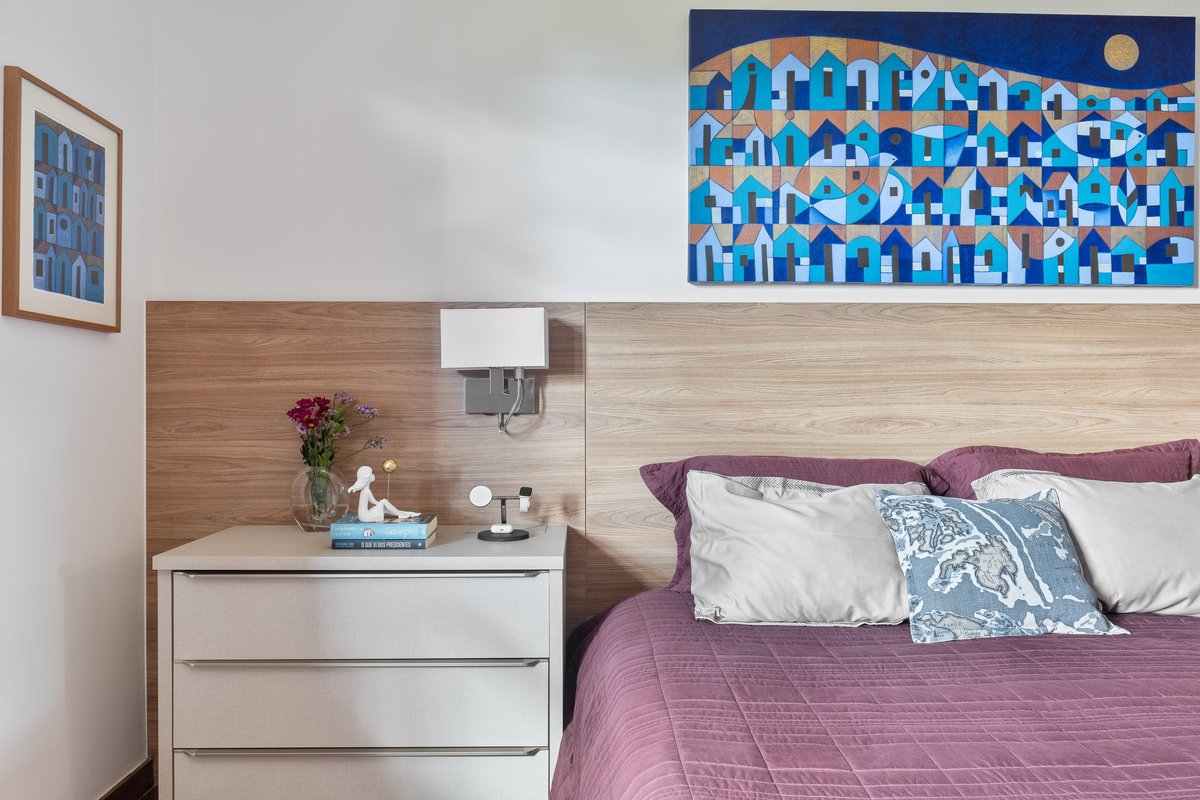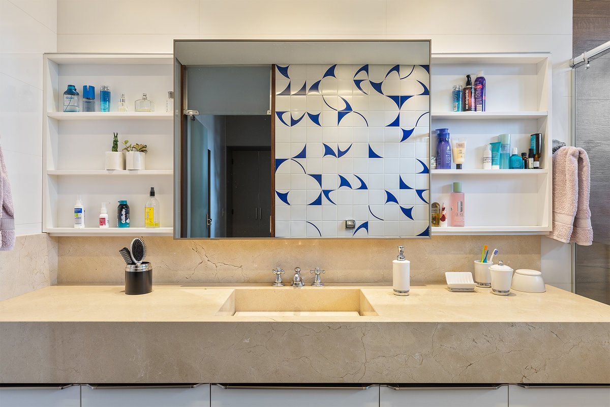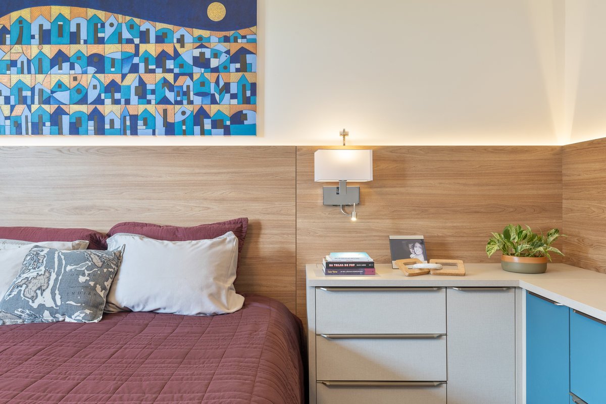 O ambiente ganhou uma cama com baú na ponta — prática para armazenar roupas de cama e servir de assento —, penteadeira e ampla área de armazenamento. O closet, acessado por uma porta mimetizada, é generoso em espaço e leva ao banheiro, totalmente reformado. O destaque fica para as duas cubas esculpidas e o painel exclusivo de azulejos personalizados na cor azul, que imprime sofisticação e identidade ao espaço.