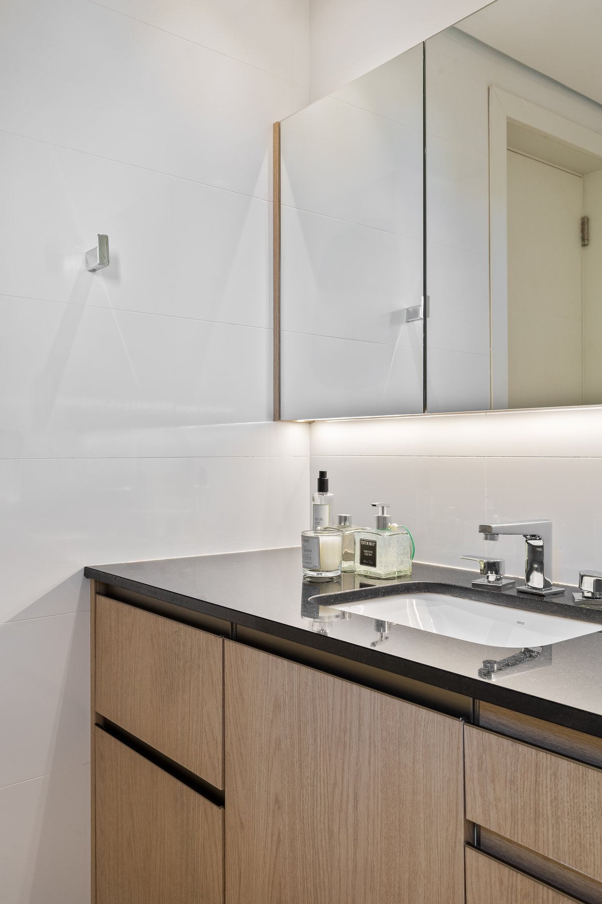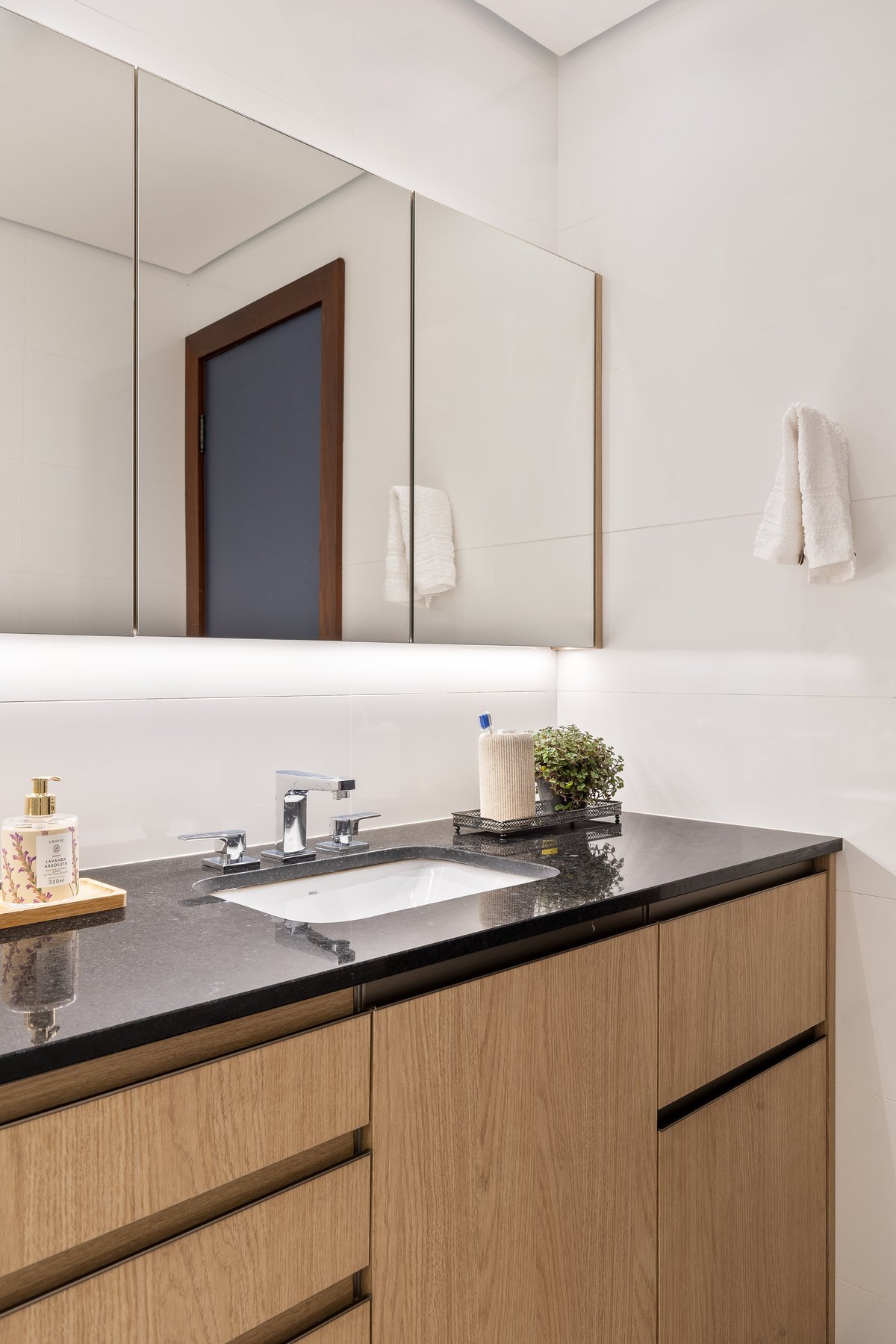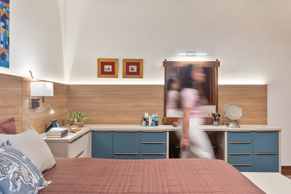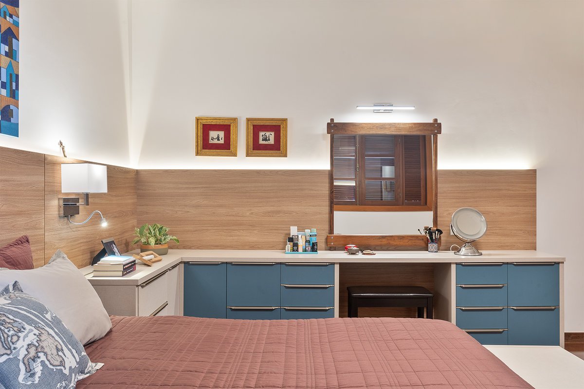 O ambiente ganhou uma cama com baú na ponta — prática para armazenar roupas de cama e servir de assento —, penteadeira e ampla área de armazenamento. O closet, acessado por uma porta mimetizada, é generoso em espaço e leva ao banheiro, totalmente reformado. O destaque fica para as duas cubas esculpidas e o painel exclusivo de azulejos personalizados na cor azul, que imprime sofisticação e identidade ao espaço.