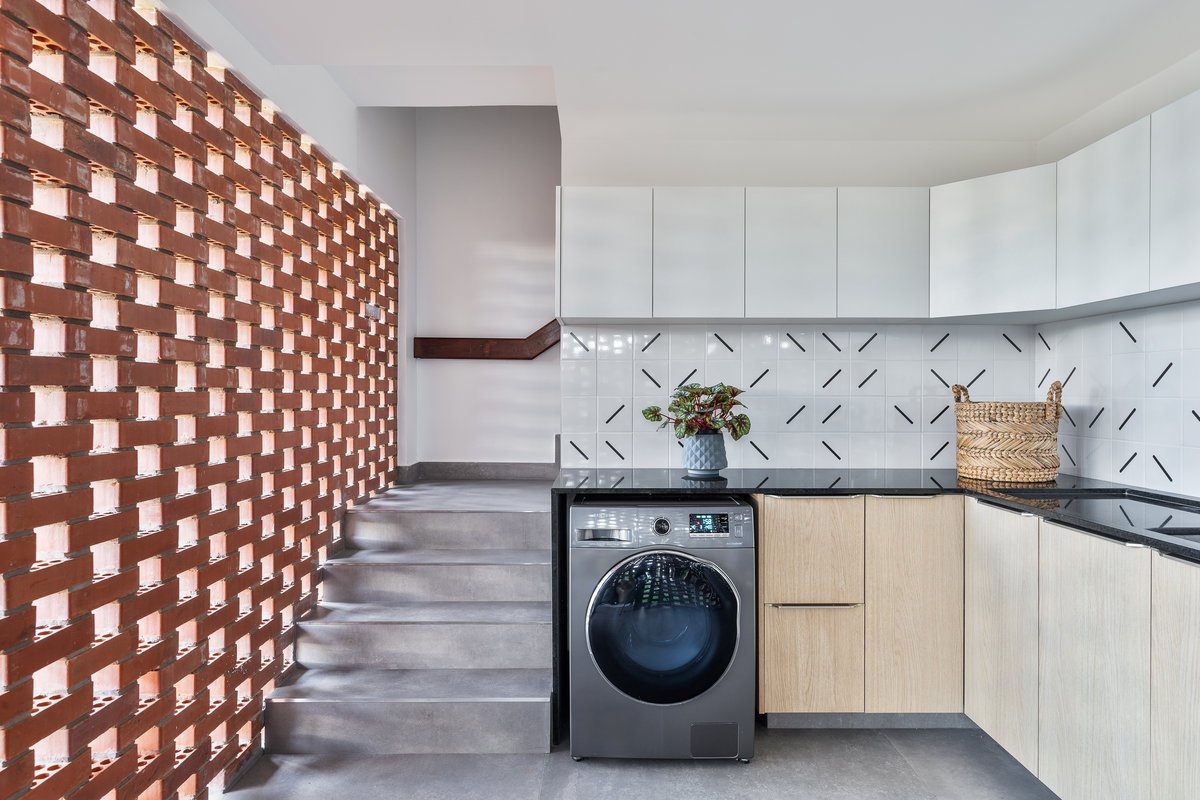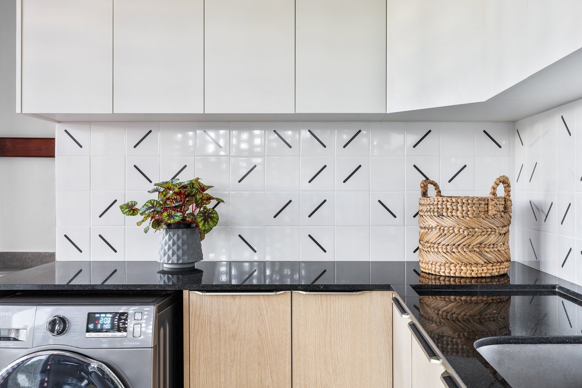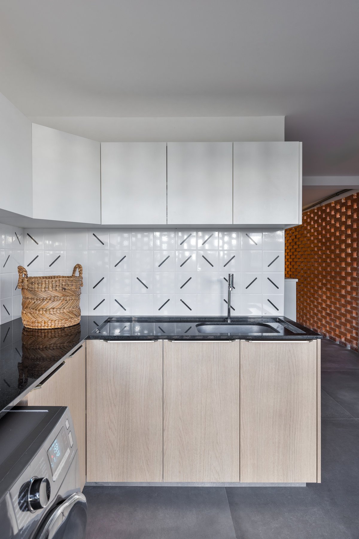 Antes pouco funcional, a área de serviço foi transformada em um espaço prático e moderno. Uma bancada em “L” de grandes proporções, aliada à marcenaria planejada, trouxe a solução de armazenamento necessária para roupas, produtos de limpeza e utensílios da lavanderia. O ambiente também recebeu um azulejo exclusivo, garantindo identidade até nos espaços de apoio.