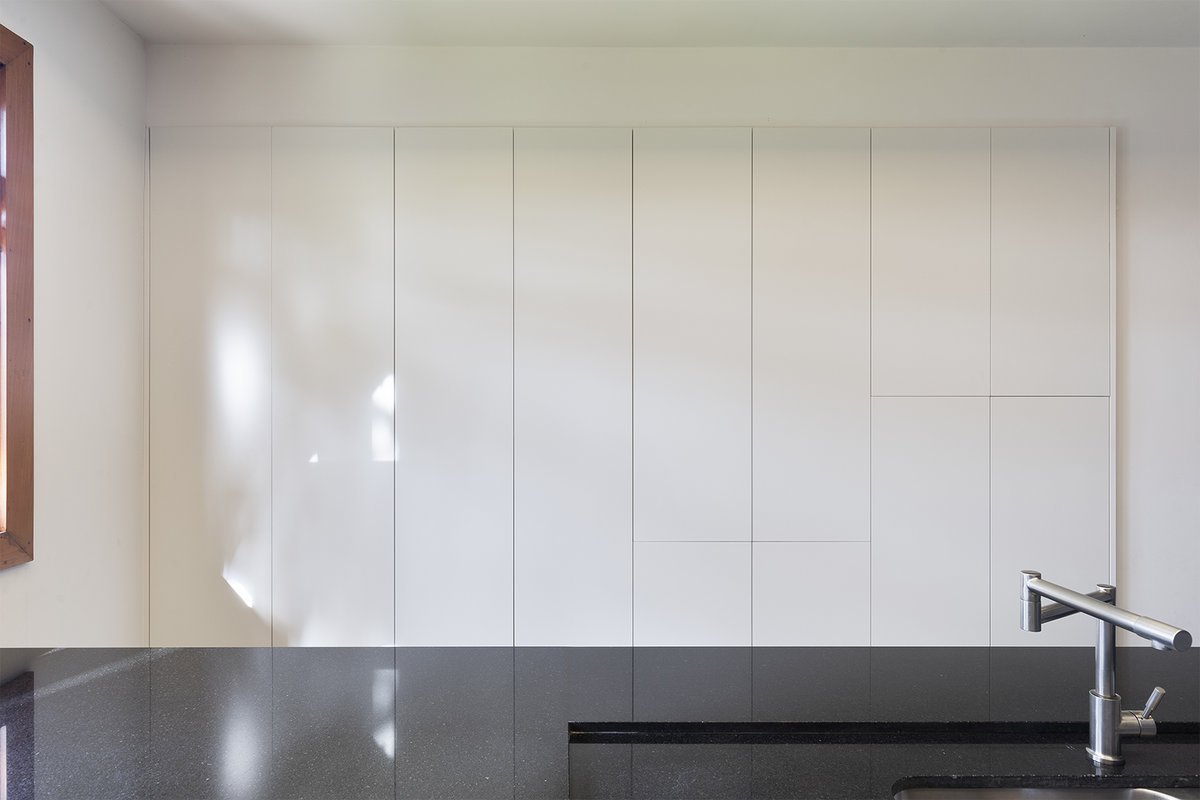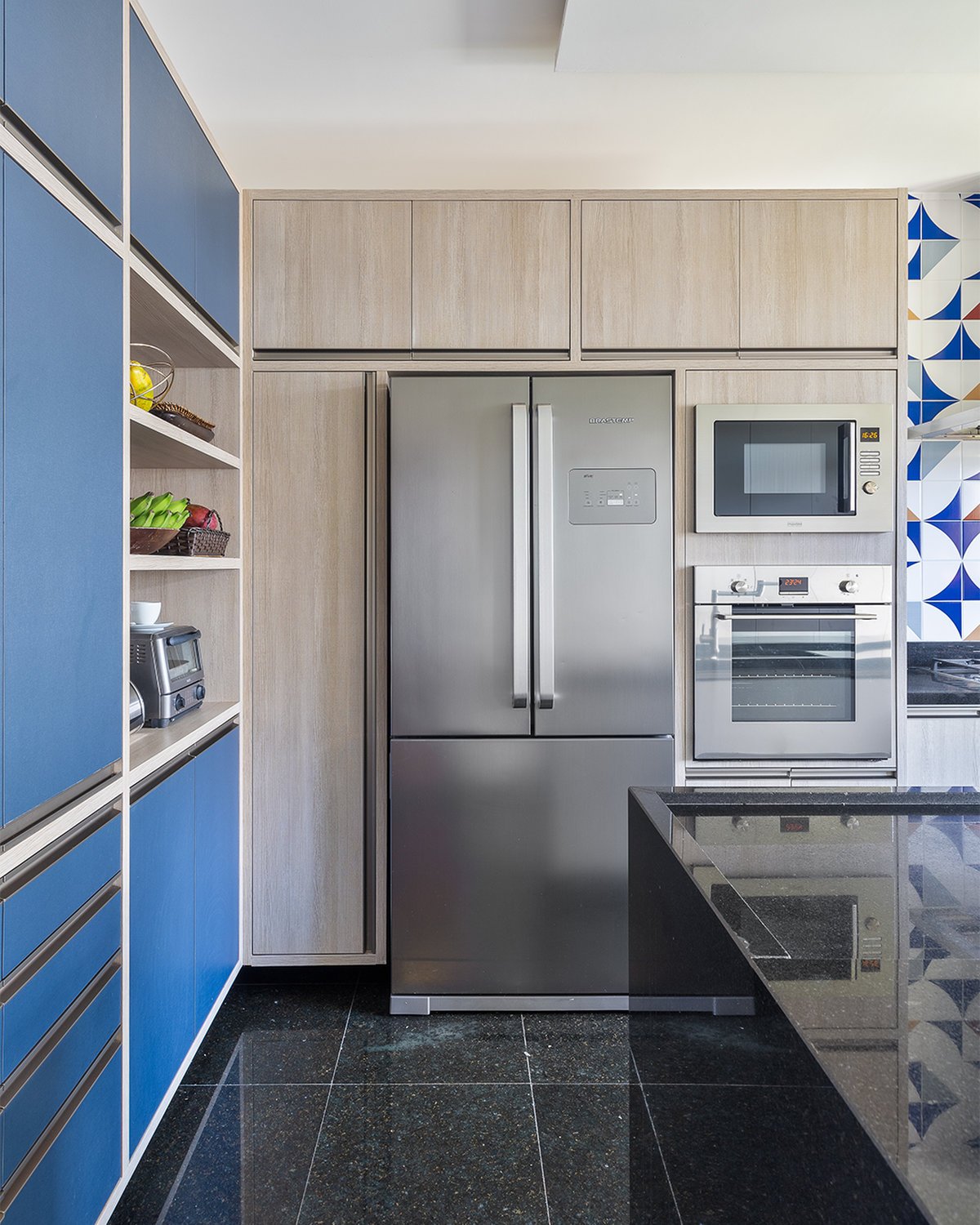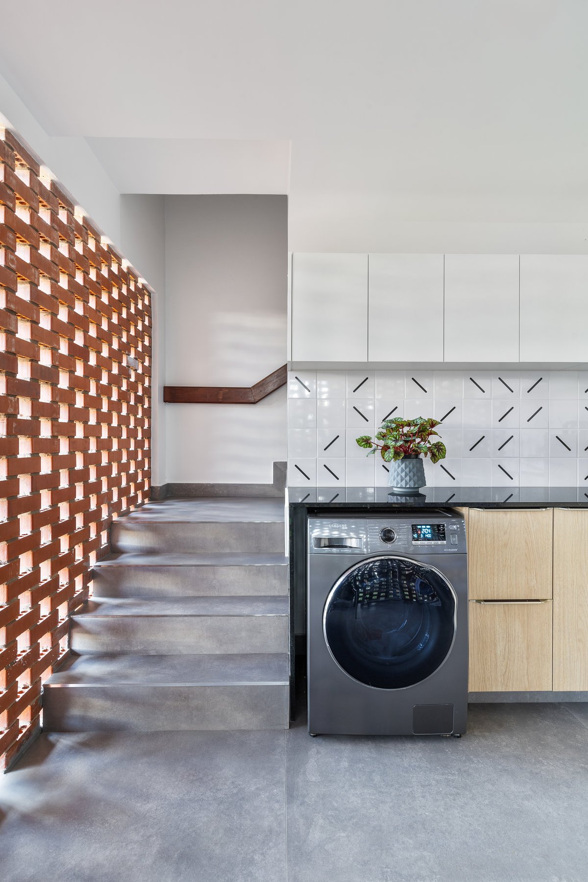 Antes pouco funcional, a área de serviço foi transformada em um espaço prático e moderno. Uma bancada em “L” de grandes proporções, aliada à marcenaria planejada, trouxe a solução de armazenamento necessária para roupas, produtos de limpeza e utensílios da lavanderia. O ambiente também recebeu um azulejo exclusivo, garantindo identidade até nos espaços de apoio.