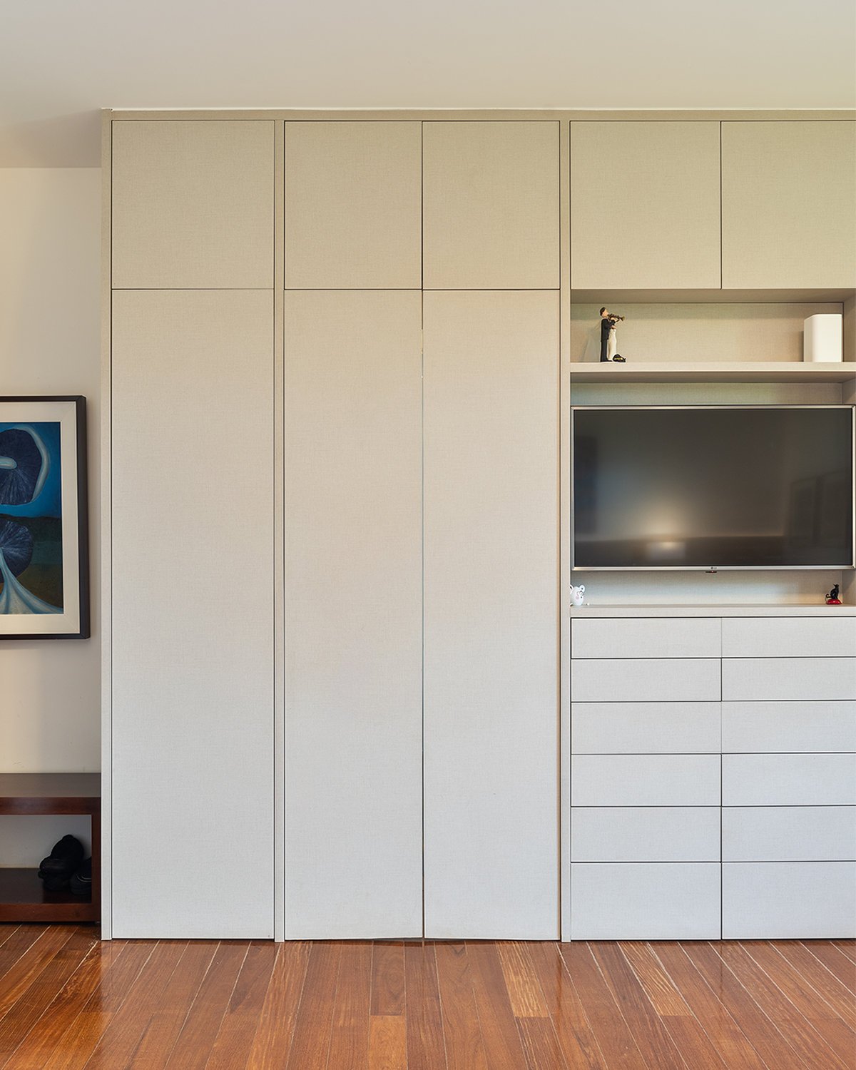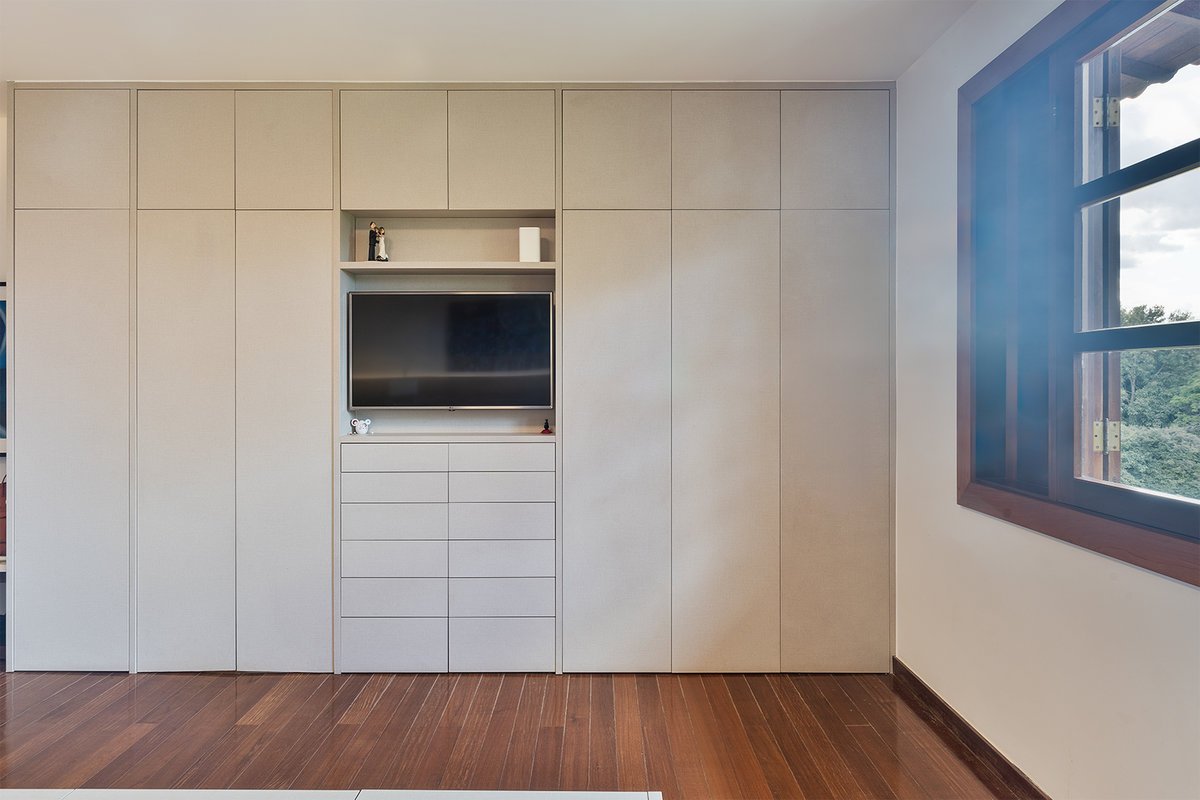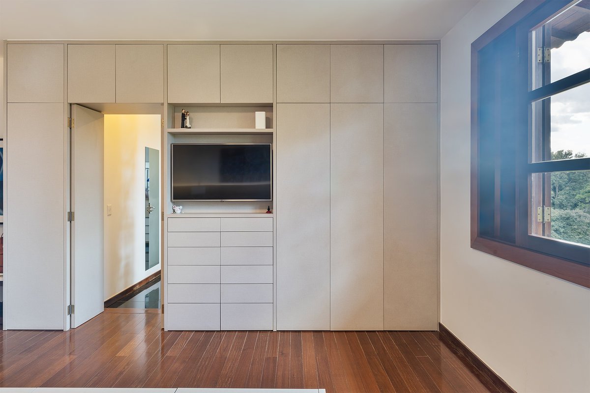 A suíte principal passou por uma transformação completa. A parede que separava o quarto do closet foi removida e substituída por uma solução inteligente em marcenaria, otimizando o espaço sem a necessidade de divisórias em alvenaria.