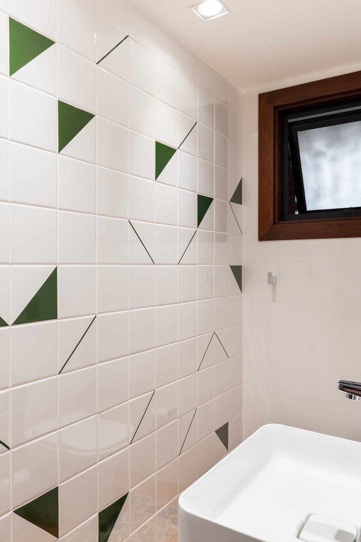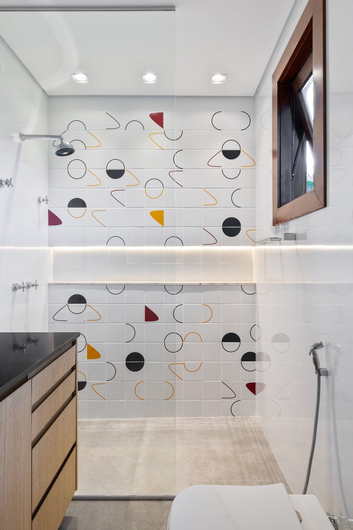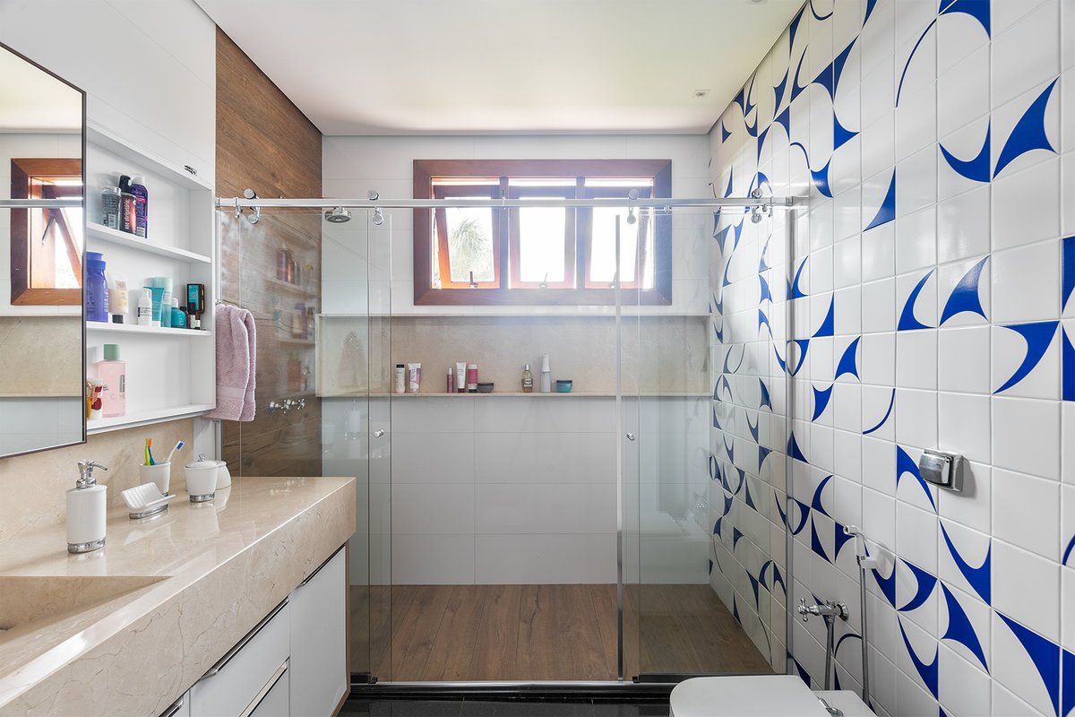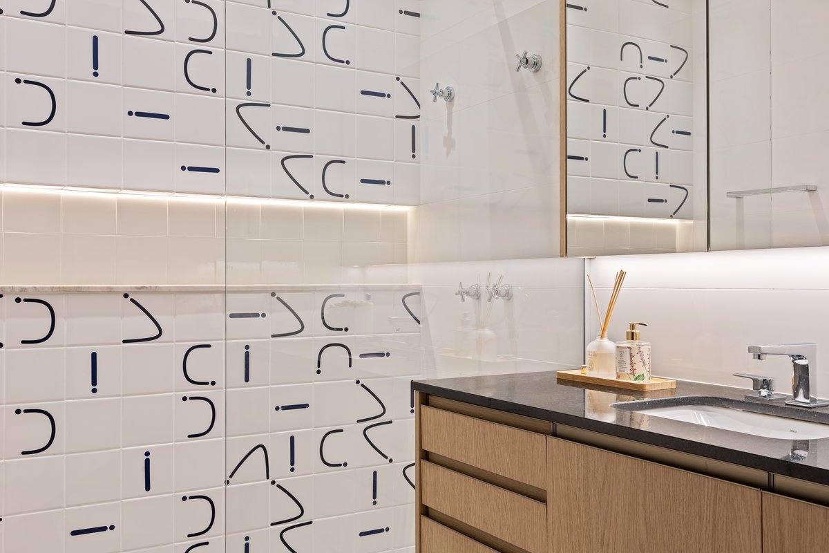 O que antes era apenas um lavabo sob a escada foi reinventado como uma suíte estúdio completa. A área ganhou box, marcenaria inteligente e um painel de azulejos personalizados, transformando um espaço ocioso em um ambiente funcional e cheio de estilo.
