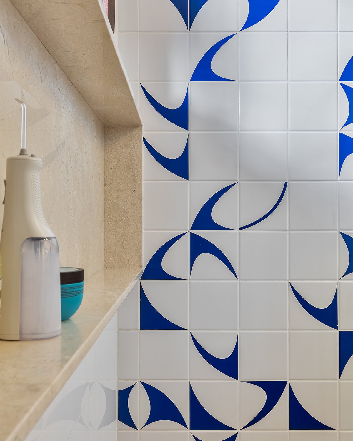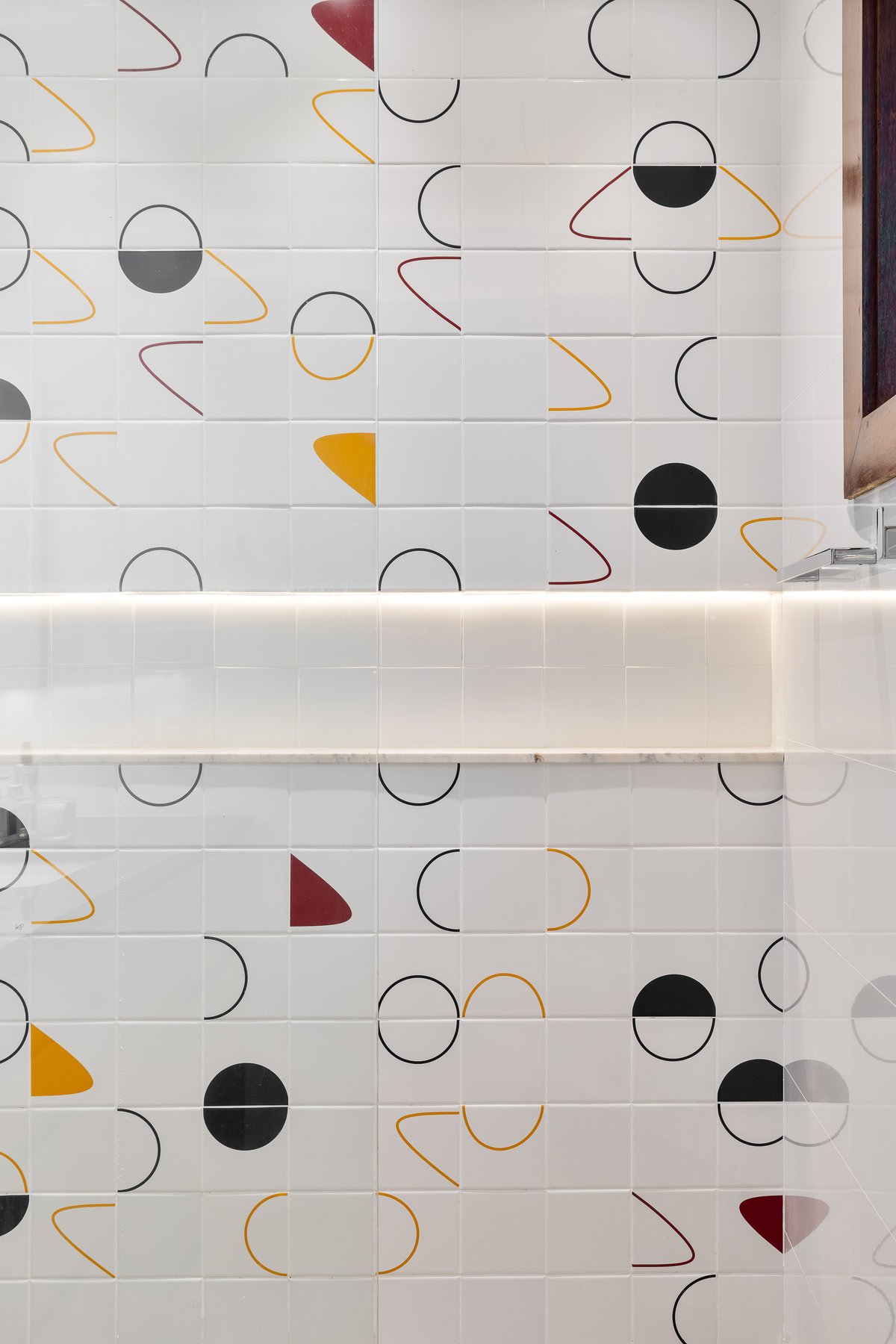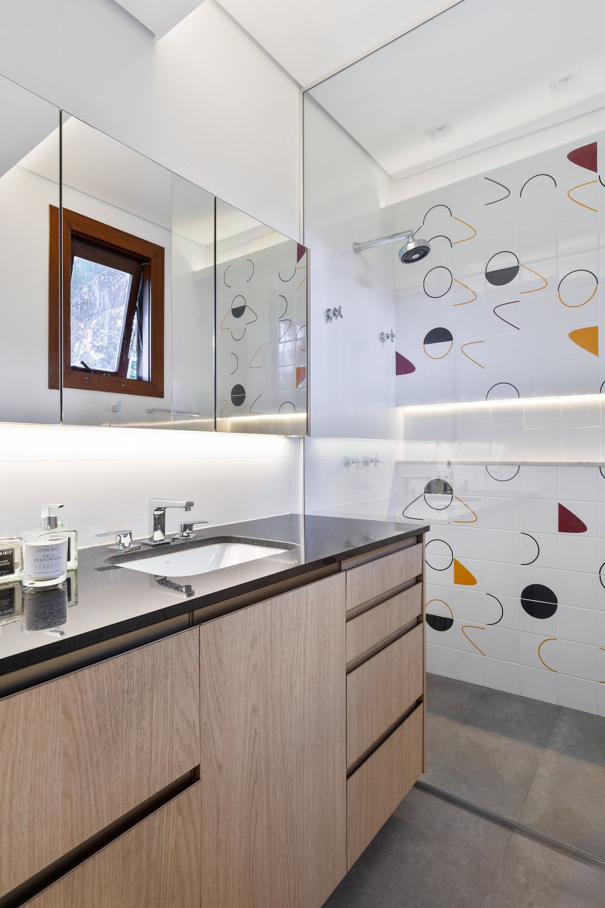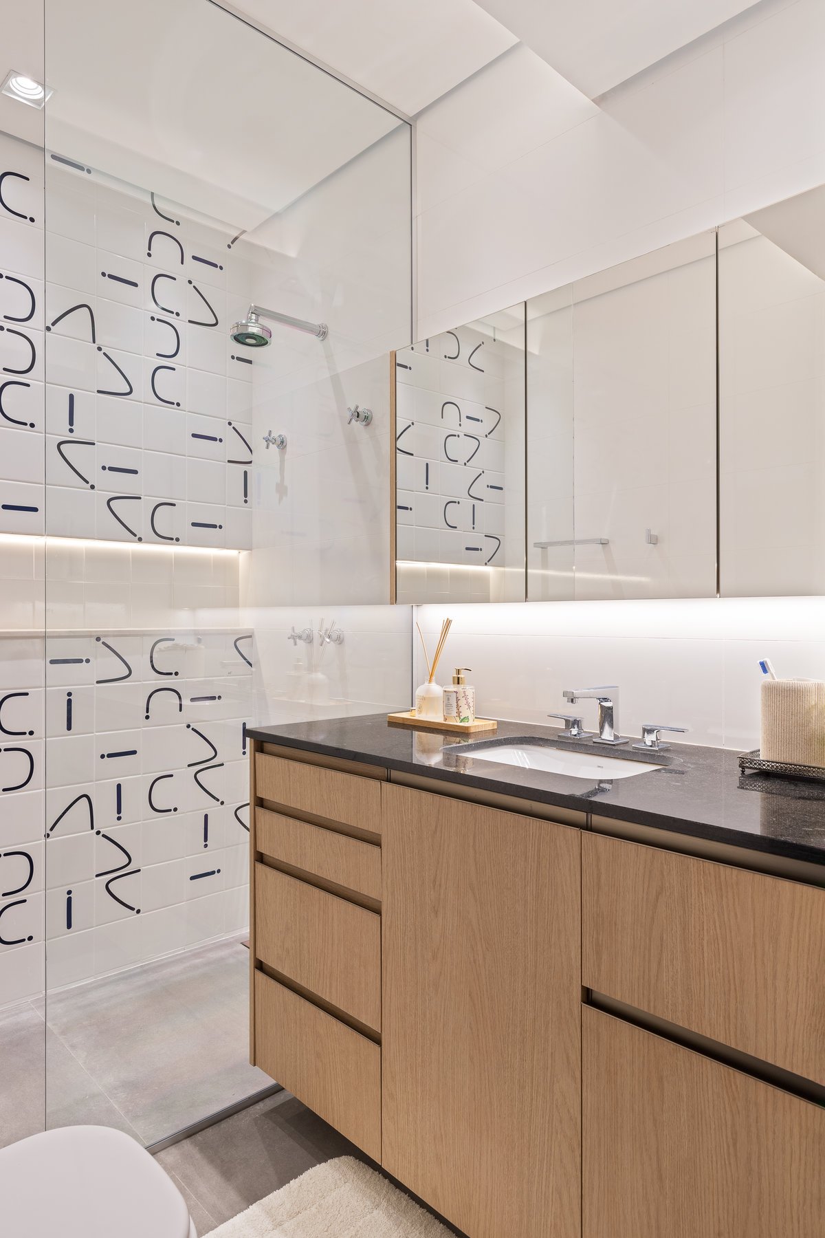 O que antes era apenas um lavabo sob a escada foi reinventado como uma suíte estúdio completa. A área ganhou box, marcenaria inteligente e um painel de azulejos personalizados, transformando um espaço ocioso em um ambiente funcional e cheio de estilo.