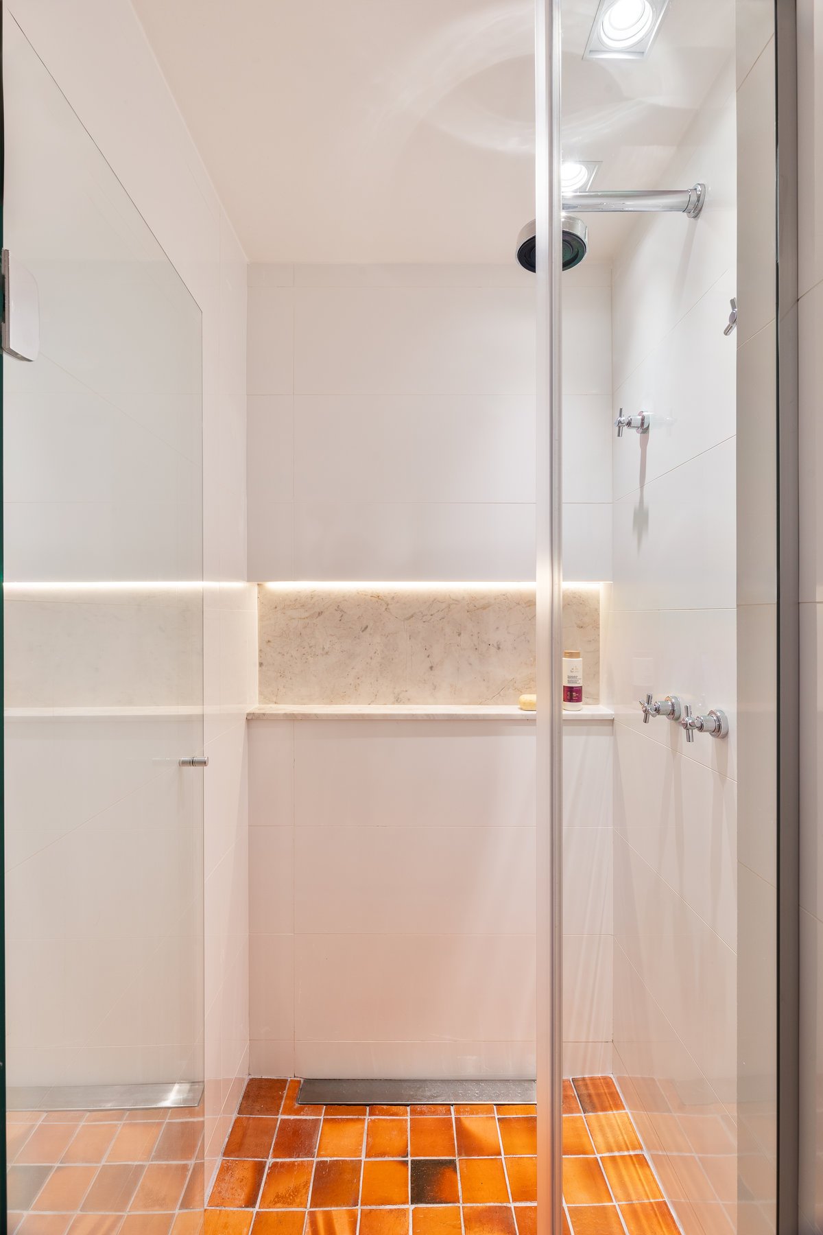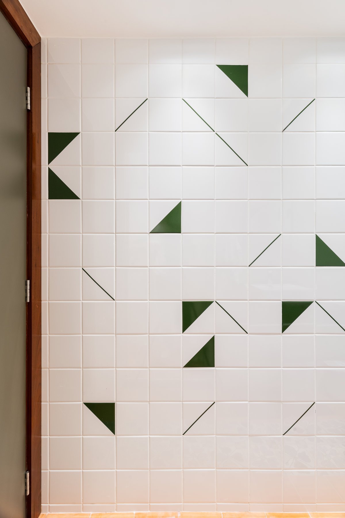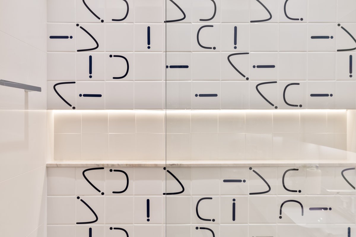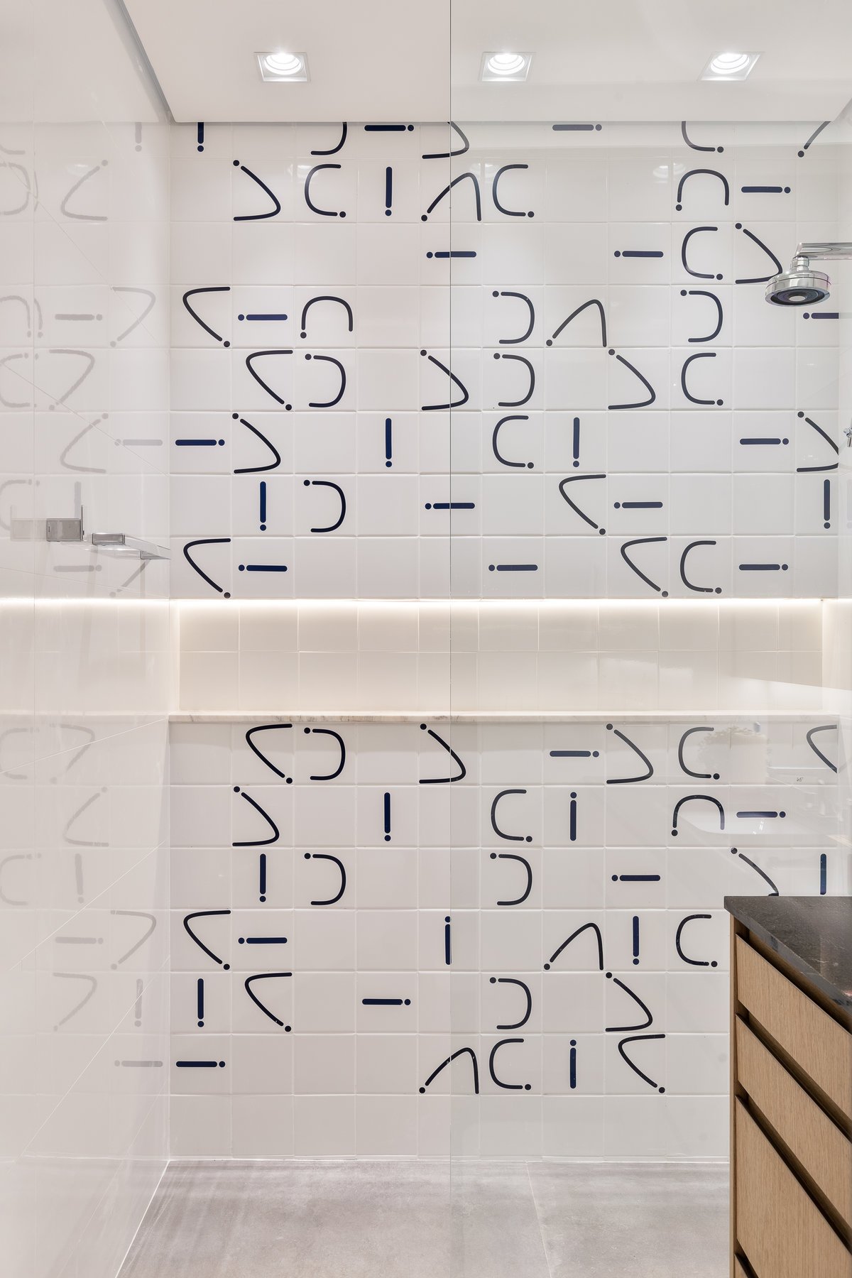O que antes era apenas um lavabo sob a escada foi reinventado como uma suíte estúdio completa. A área ganhou box, marcenaria inteligente e um painel de azulejos personalizados, transformando um espaço ocioso em um ambiente funcional e cheio de estilo.