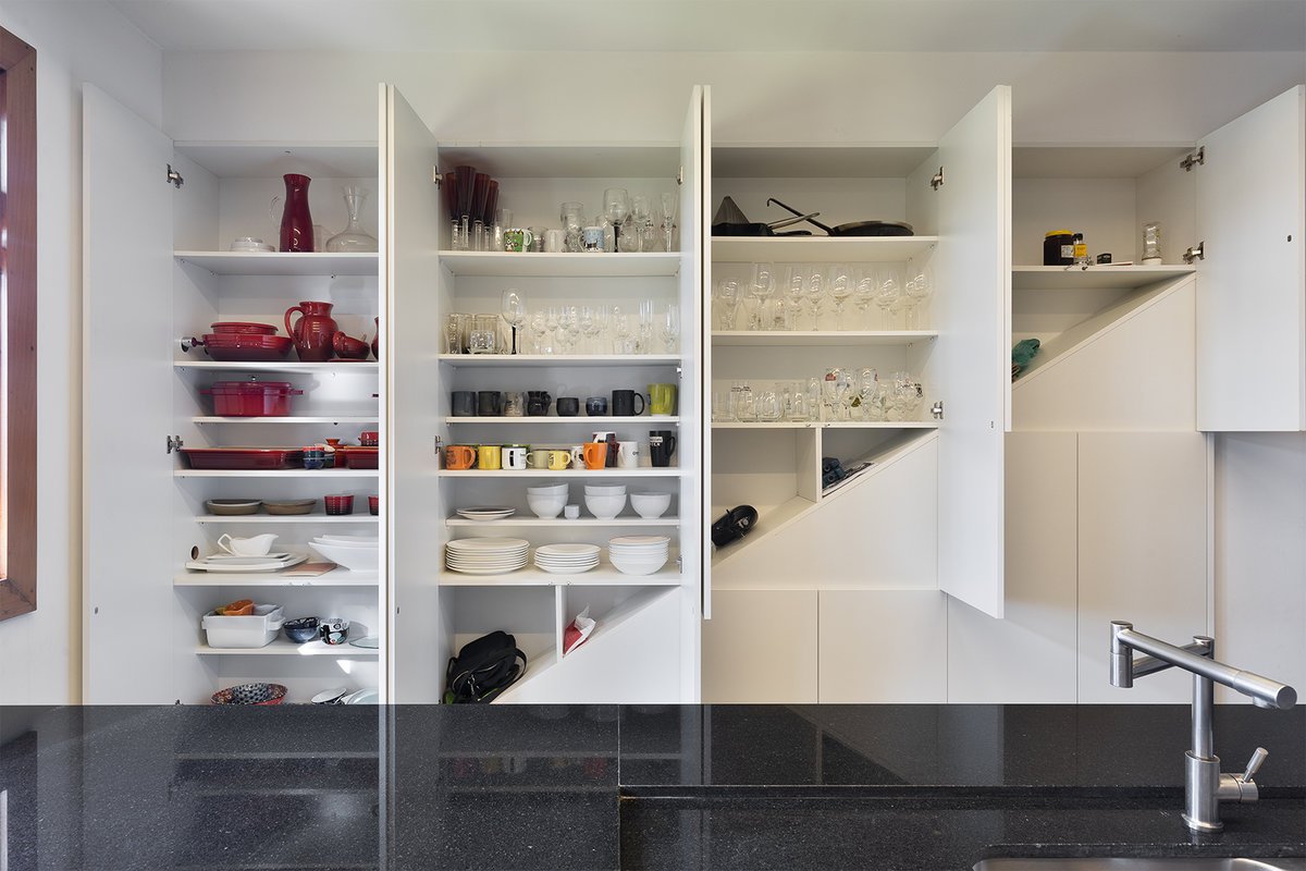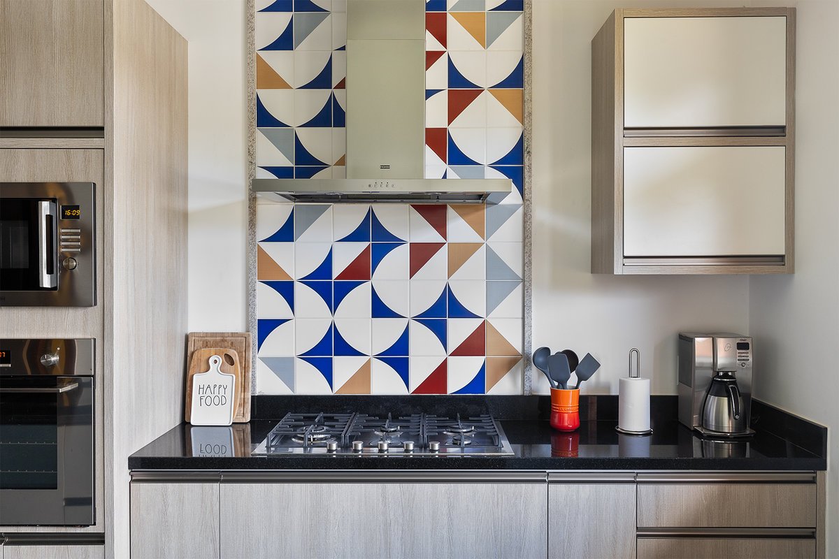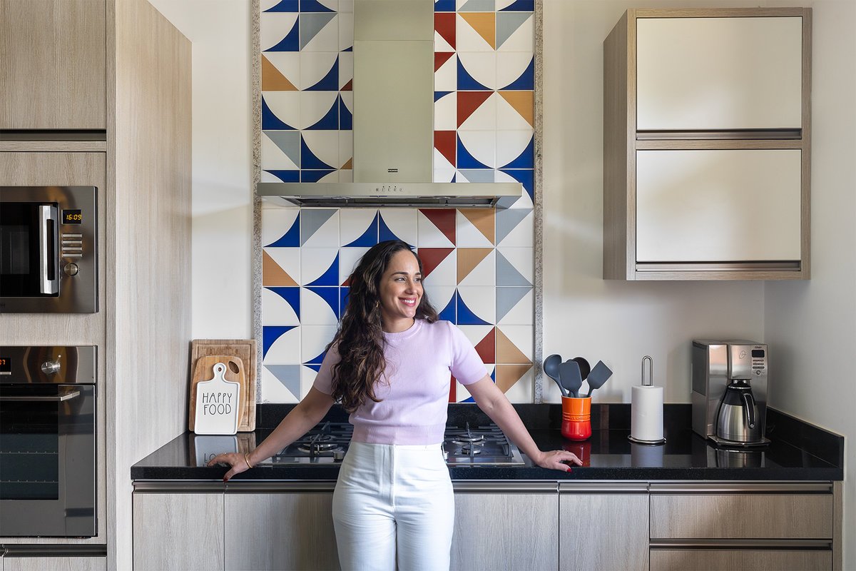 O contraste entre os tons neutros e o painel de azulejos coloridos trouxe vitalidade e modernidade ao projeto. A marcenaria embutida, parte dela aérea sobre a escada, foi projetada para otimizar espaço e circulação, garantindo praticidade sem comprometer a estética.
