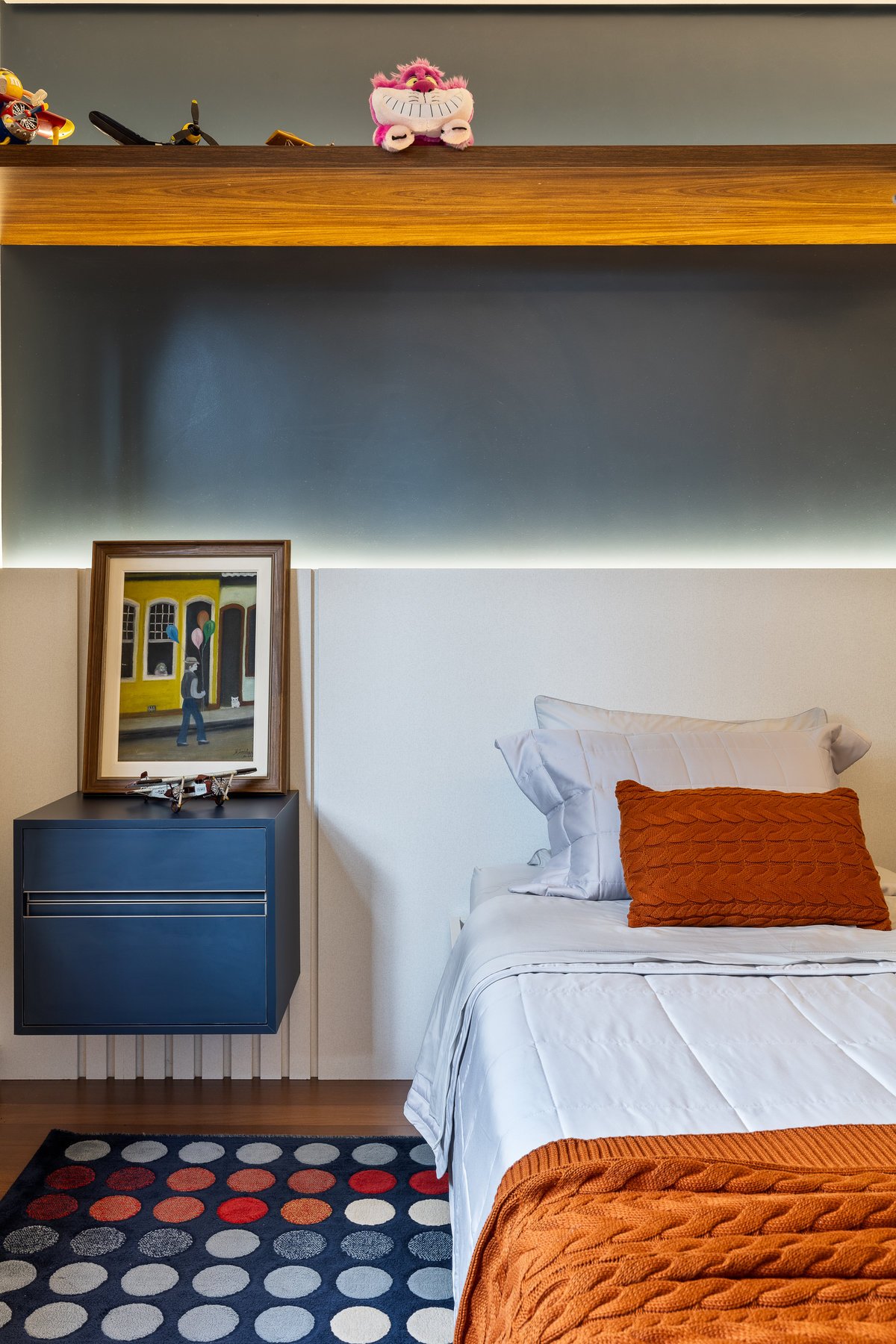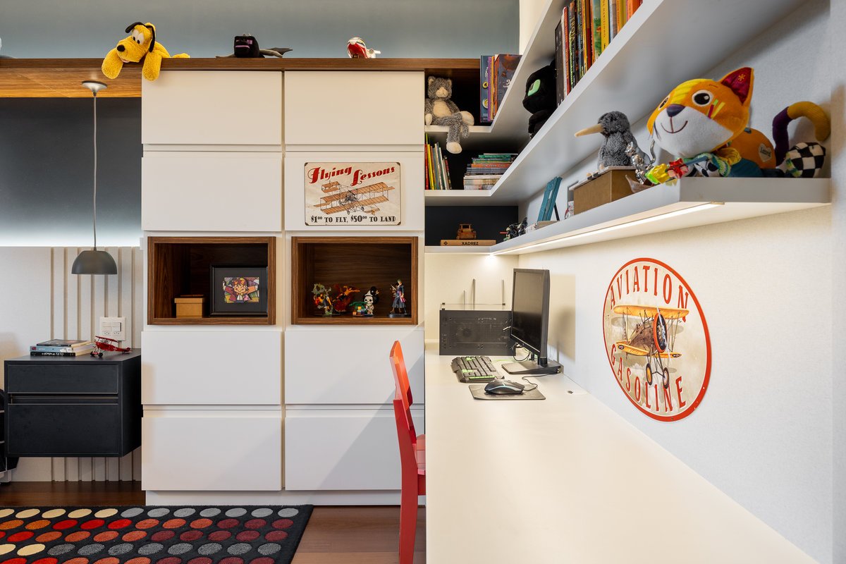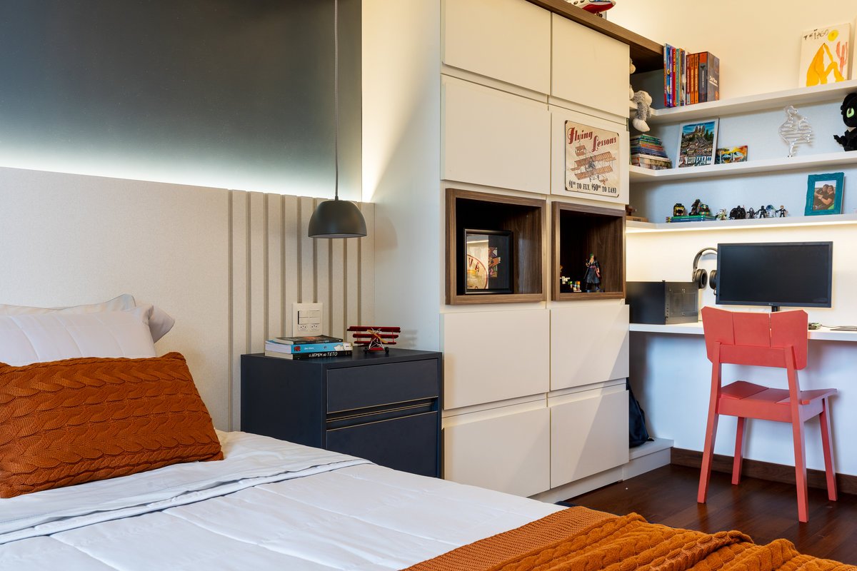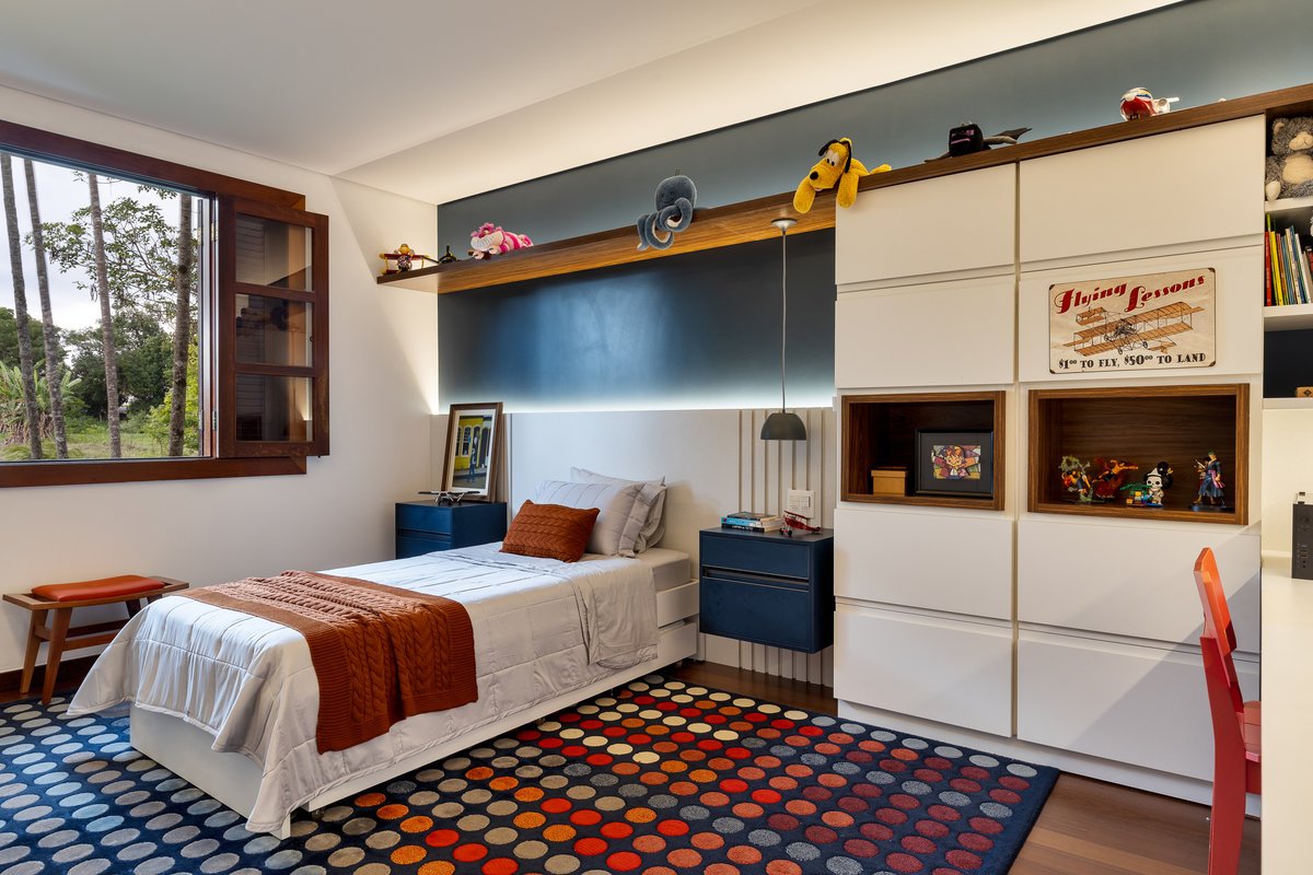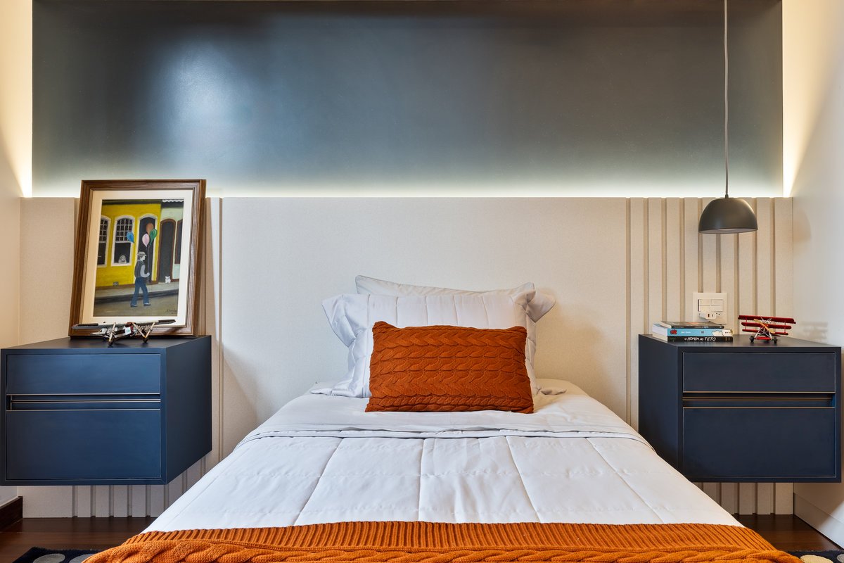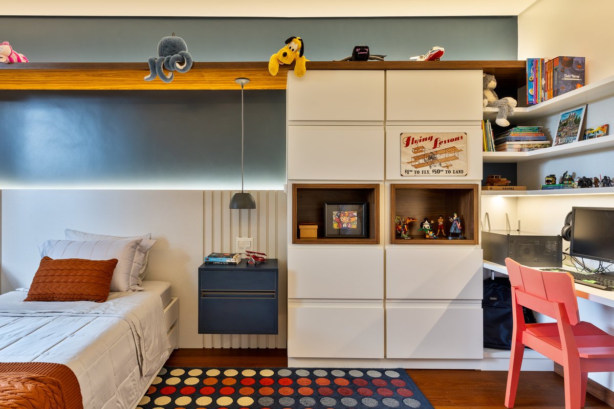 O quarto do Tiago foi repensado para aproveitar elementos já existentes, como parte do guarda-roupa e um belo tapete em tons azuis e terrosos, que inspirou toda a paleta de cores e decoração. A suíte ganhou um painel de azulejos vibrantes e alegres, trazendo dinamismo e traduzindo a personalidade espontânea do jovem morador.