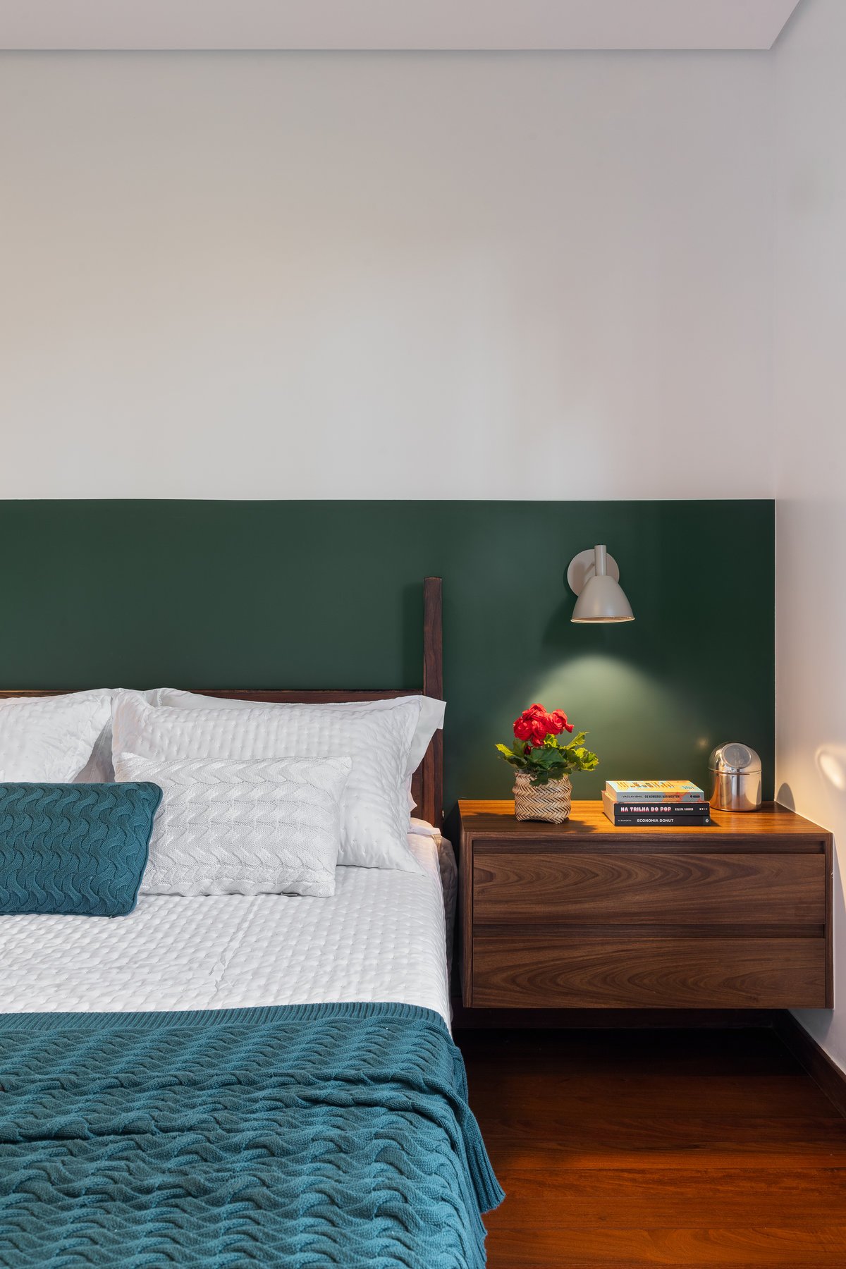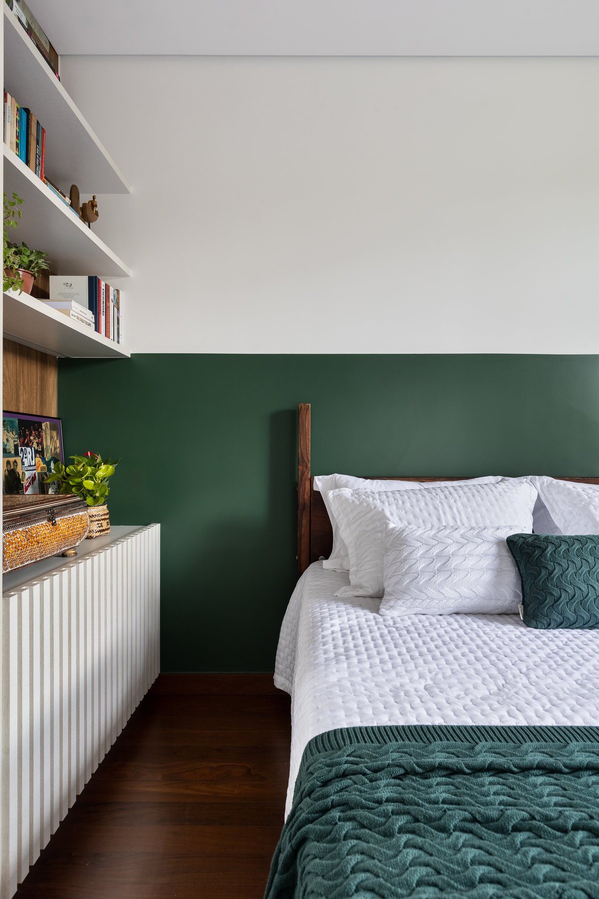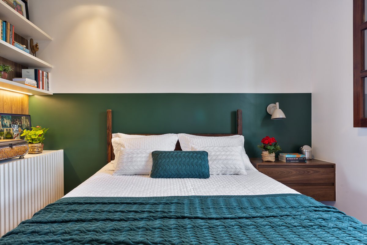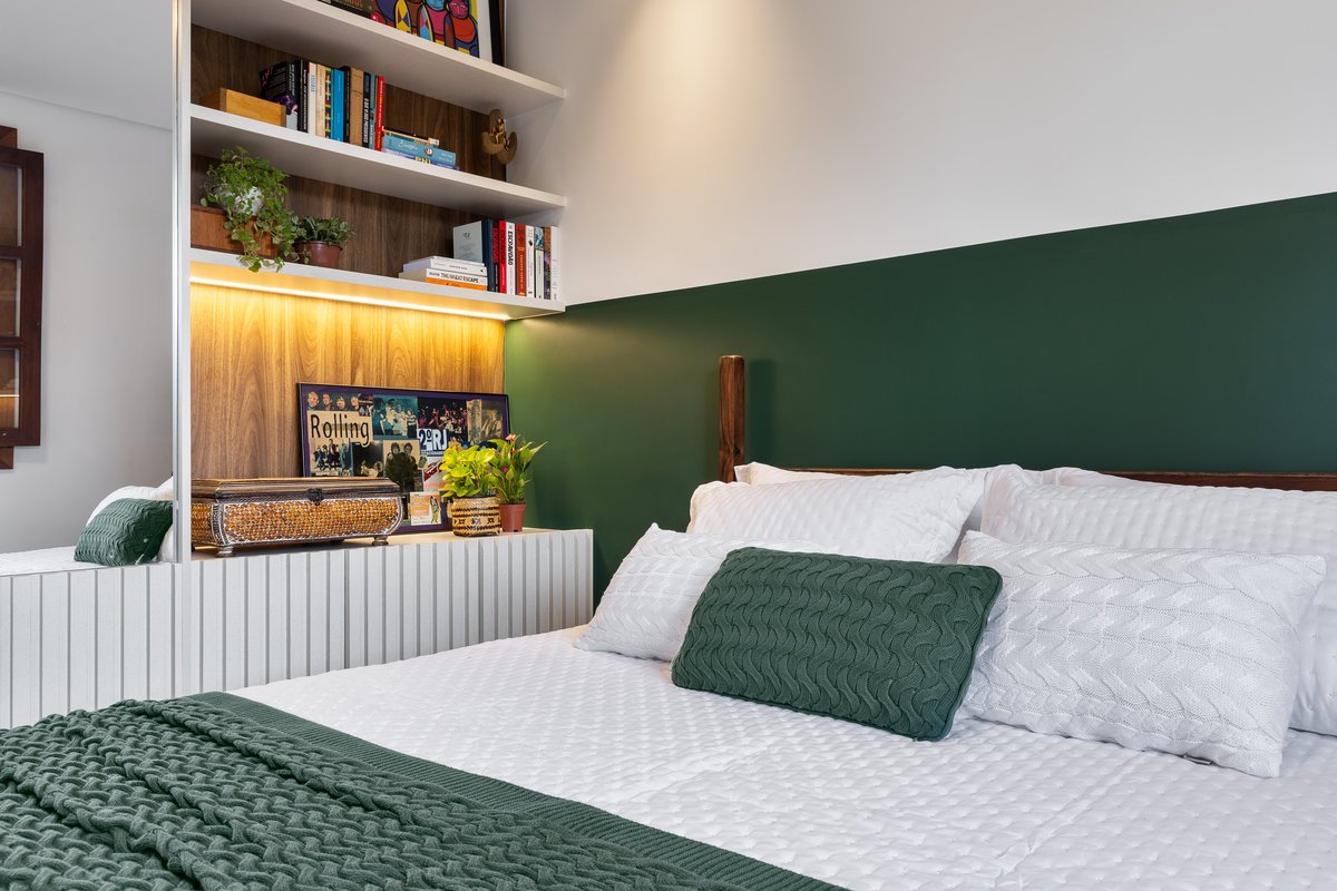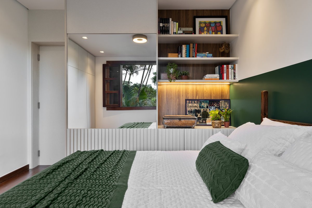 Originalmente um banheiro social, o espaço foi remanejado para dar vida à suíte da Cecília. O quarto recebeu uma cama de casal e marcenaria planejada, aproveitando ao máximo o ambiente. No banheiro, os tons amadeirados do carvalho se unem a azulejos personalizados, com movimento e personalidade, refletindo a essência da moradora.