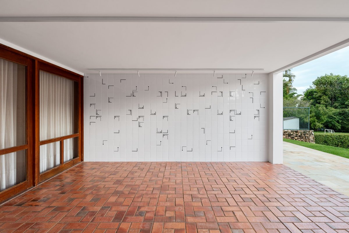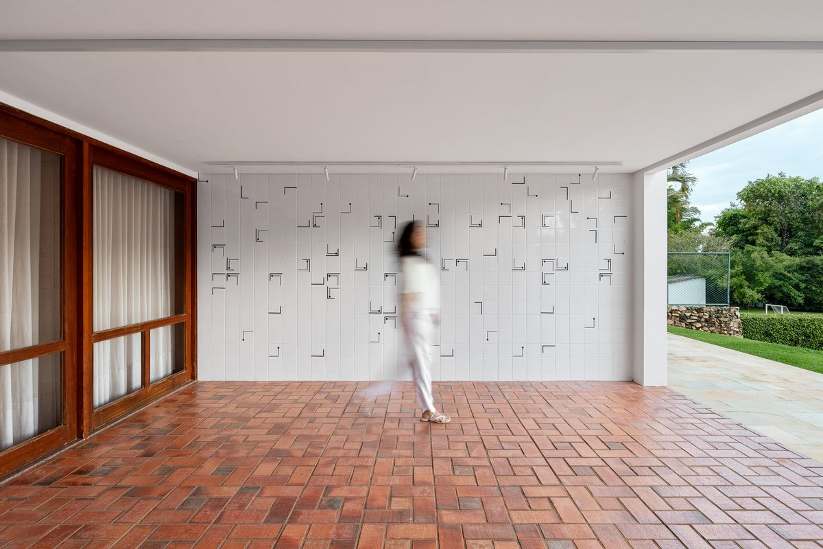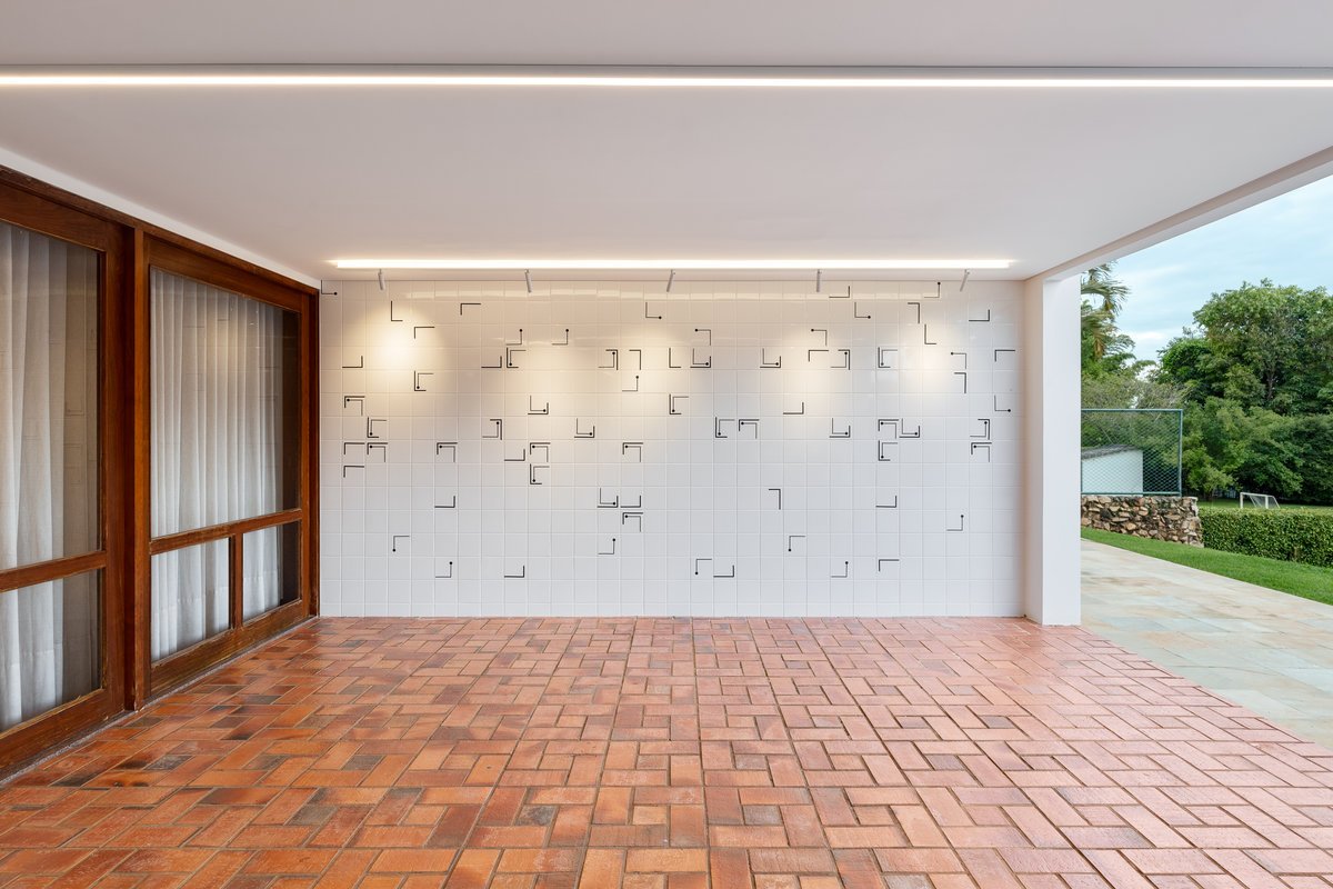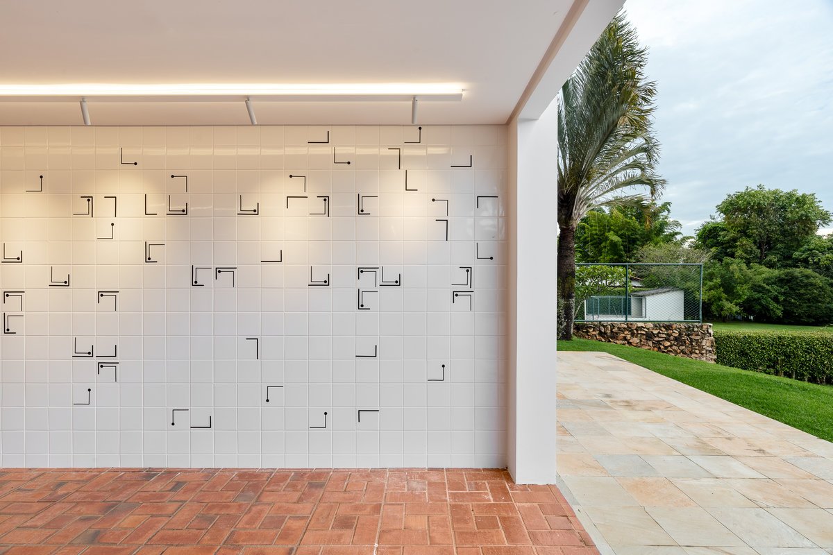 Na área externa, o grande destaque é um painel de azulejos exclusivo, desenvolvido em preto e branco, com bastante movimento e dinamismo. A composição única traz sofisticação e força estética ao espaço, tornando-se uma verdadeira obra de arte a céu aberto. O contraste elegante entre o branco do azulejo e a intensidade do preto garante imponência e personalidade, criando um ponto focal marcante para toda a área externa da casa.