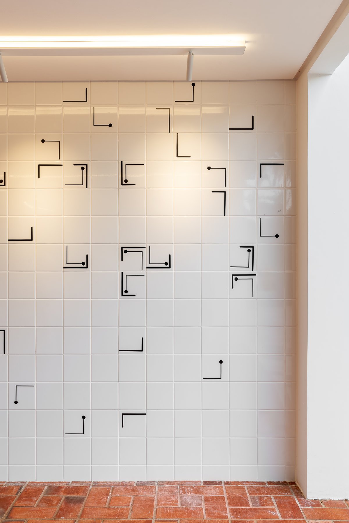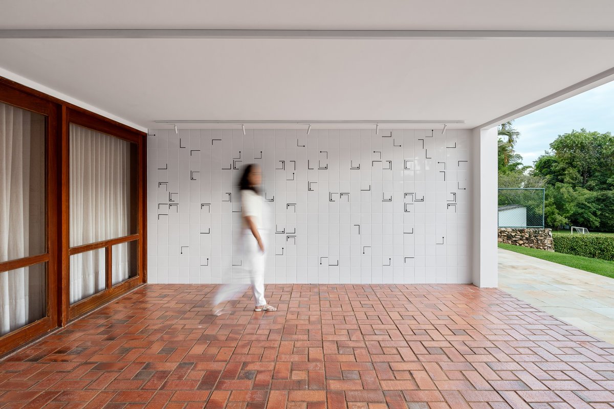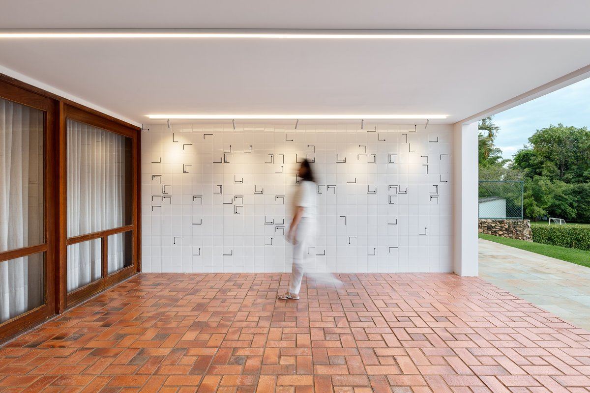 Na área externa, o grande destaque é um painel de azulejos exclusivo, desenvolvido em preto e branco, com bastante movimento e dinamismo. A composição única traz sofisticação e força estética ao espaço, tornando-se uma verdadeira obra de arte a céu aberto. O contraste elegante entre o branco do azulejo e a intensidade do preto garante imponência e personalidade, criando um ponto focal marcante para toda a área externa da casa.